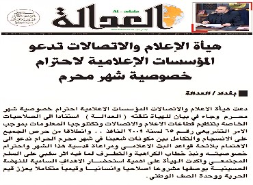 صحيفة العدالة .. هيأة الاعلام والاتصالات تدعو المؤسسات الاعلامية لإحترام خصوصية شهر محرم