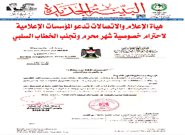 صحيفة البينة الجديدة .. هيأة الاعلام والاتصالات تدعو المؤسسات الاعلامية لإحترام خصوصية شهر محرم وتجنب الخطاب السلبي