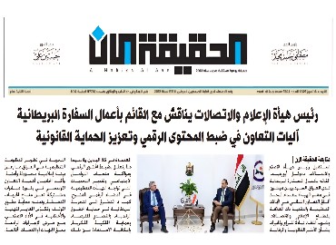 صحيفة الحقيقة الان..رئيس هيأة الاعلام والاتصالات يناقش مع القائم بأعمال السفارة البريطانية الية التعاون في ضبط المحتوى الرقمي