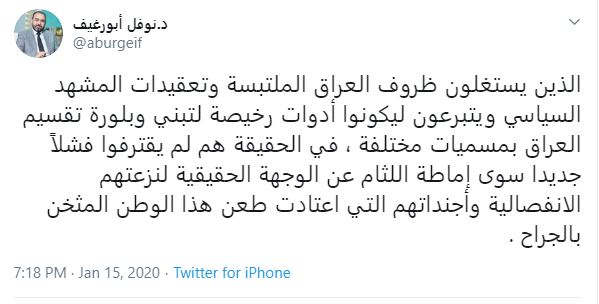 الذين يستغلون ظروف العراق الملتبسة وتعقيدات المشهد السياسي ويتبرعون ليكونوا أدوات رخيصة لتبني وبلورة تقسيم العراق بمسميات مختلفة ، في الحقيقة هم لم يقترفوا فشلاً جديدا سوى إماطة اللثام عن الوجهة الحقيقية لنزعتهم الانفصالية وأجنداتهم التي اعتادت طعن هذا الوطن المثخن بالجراح .