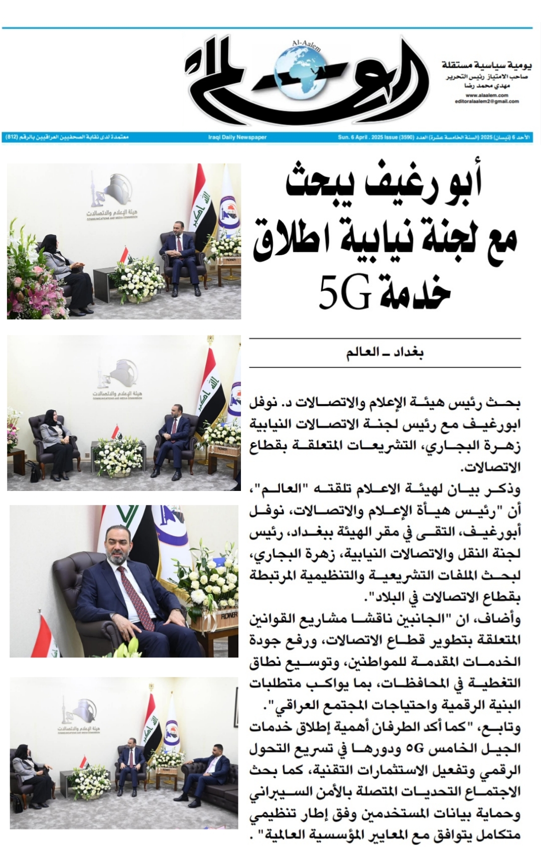 صحيفة العالم .. ابورغيف يبحث مع لجنة نيابية اطلاق خدمة 5G