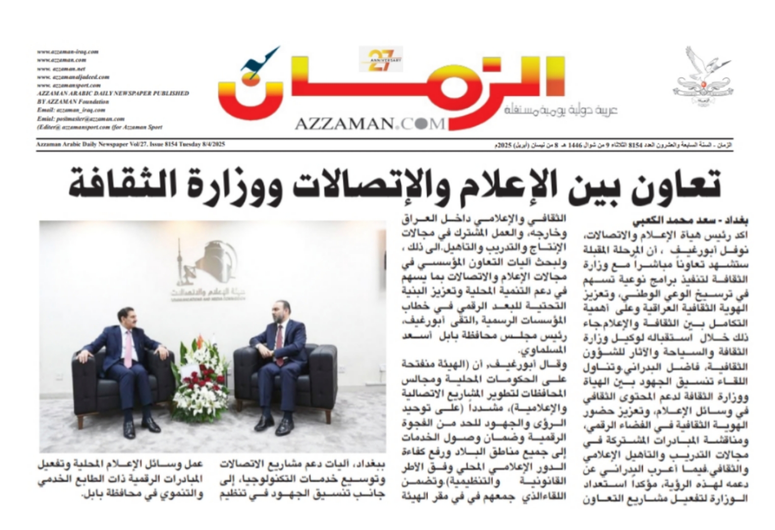 صحيفة الزمان .. تعاون بين الاعلام والاتصالات ووزارة الثقافة .