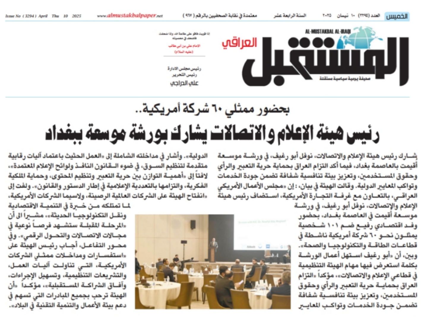 صحيفة المستقبل .. رئيس هيأة الاعلام والاتصالات يشارك بورشة موسعة ببغداد