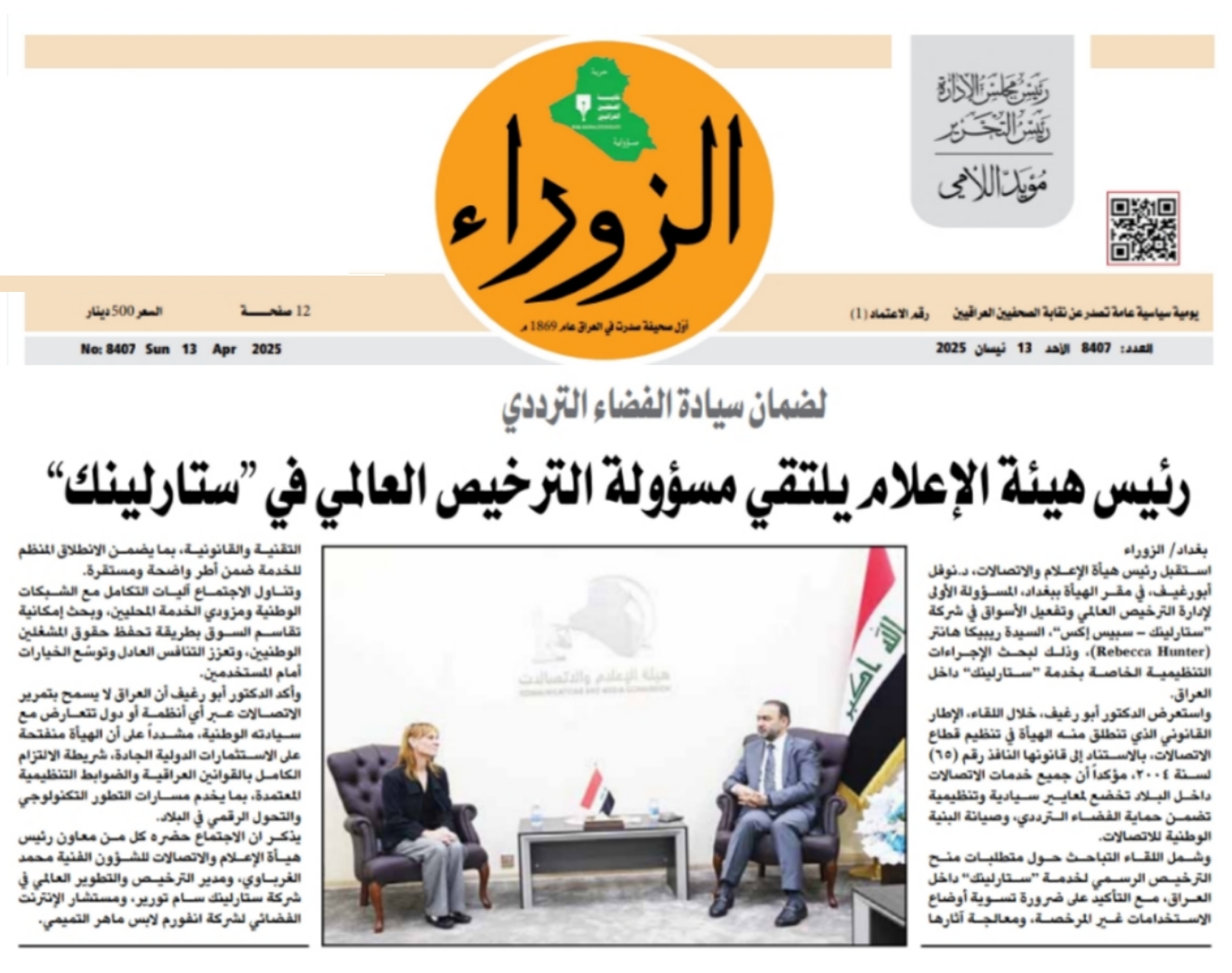 صحيفة الزوراء .. رئيس هيأة الاعلام يلتقي مسؤولة الترخيص العالمي في ستارلينك