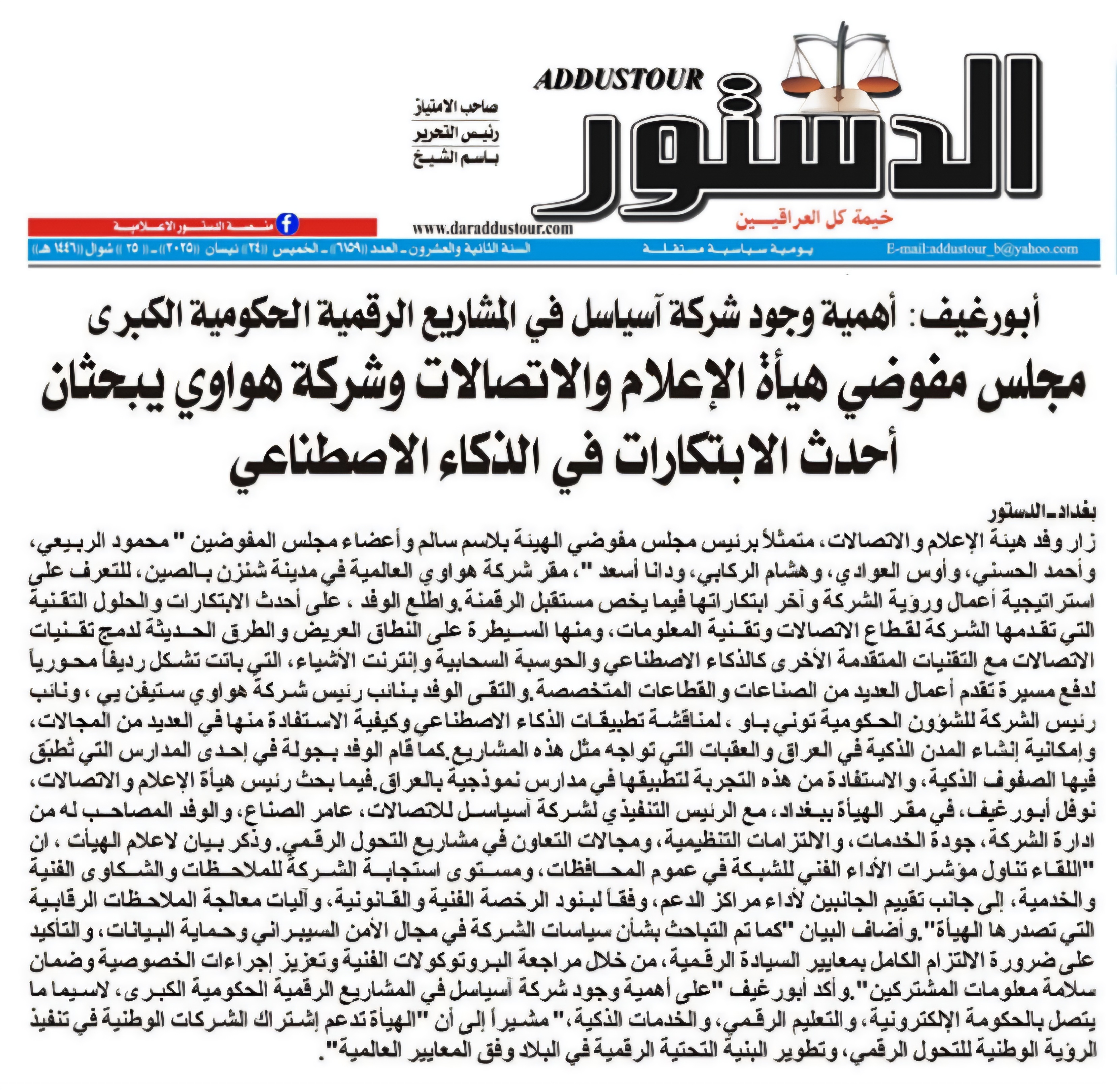 صحيفة الدستور .. ابورغيف : اهمية وجود شركة اسياسيل في المشاريع الرقمية الحكومية الكبرى