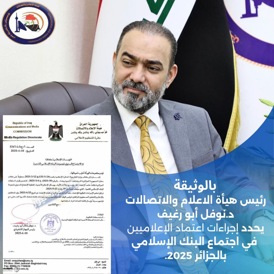 حدد رئيس هيئة الإعلام والاتصالات، د. نوفل أبو رغيف، الإجراءات المطلوبة لاعتماد الصحفيين ووكالات الأنباء ووسائل الإعلام الأجنبية، الراغبين في تغطية الاجتماع السنوي لمجموعة البنك الإسلامي للتنمية، المقرر عقده في الجزائر خلال المدة من 19 إلى 22 أيار/مايو 2025.