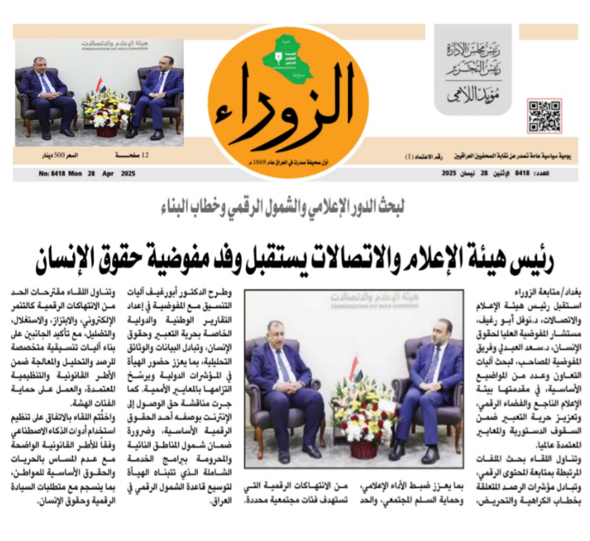 صحيفة الزوراء .. رئيس هيأة الاعلام والاتصالات يستقبل وفد مفوضية حقوق الانسان