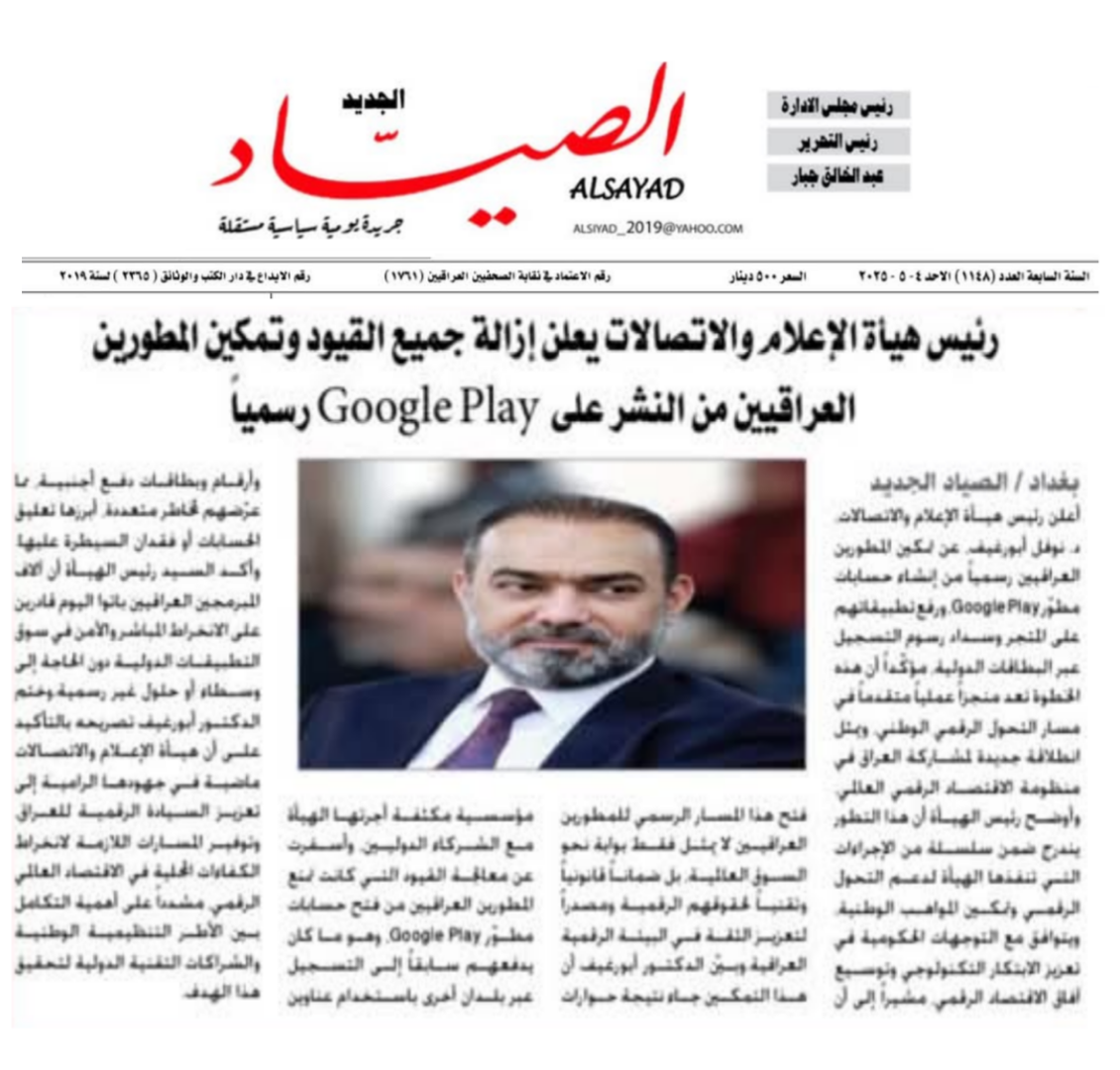 صحيفة الصياد .. رئيس هيأة الاعلام والاتصالات يعلن تمكين المطورين العراقيين من النشر على google play