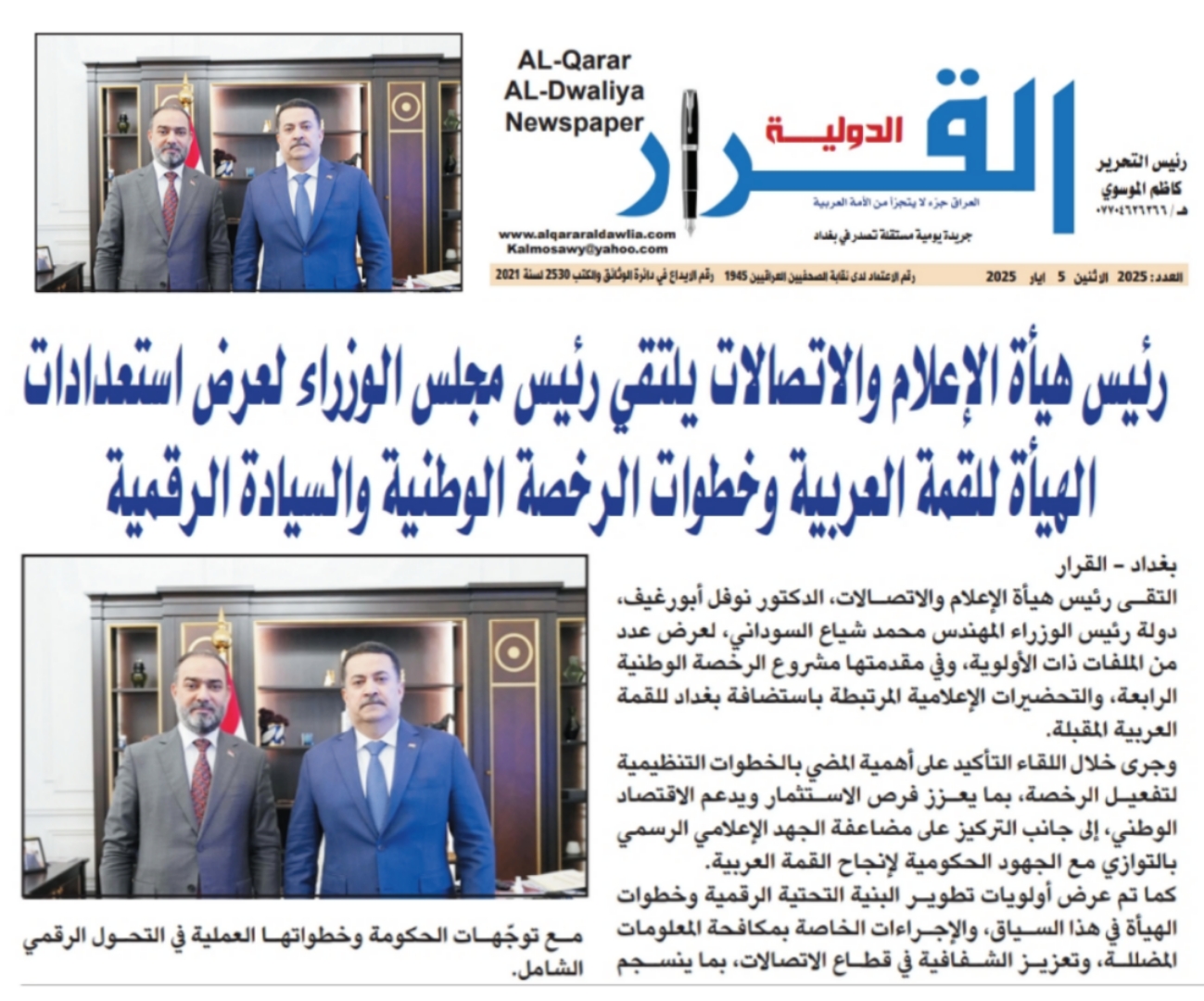 صحيفة القرار الدولية .. رئيس هيأة الاعلام والاتصالان يلتقي رئيس مجلس الوزراء لعرض استعدادات الهيأة للقمة العربية
