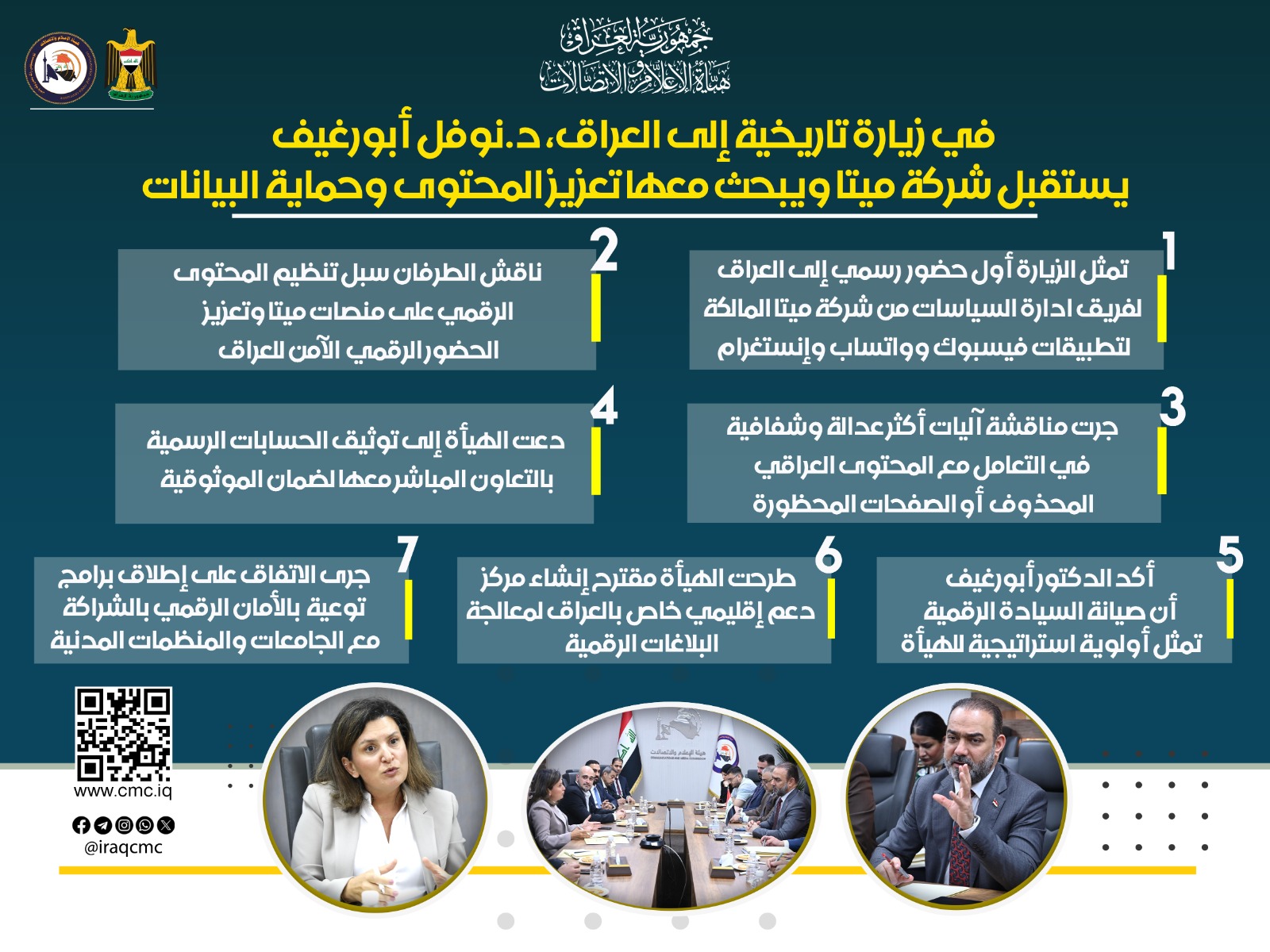 إنفوغراف: تنظيم المحتوى وتعزيز السيادة الرقمية يتصدران مباحثات رئيس هيأة الإعلام د.نوفل أبورغيف مع وفد “ميتا” المالكة لمنصات واتساب وفيسبوك وإنستغرام