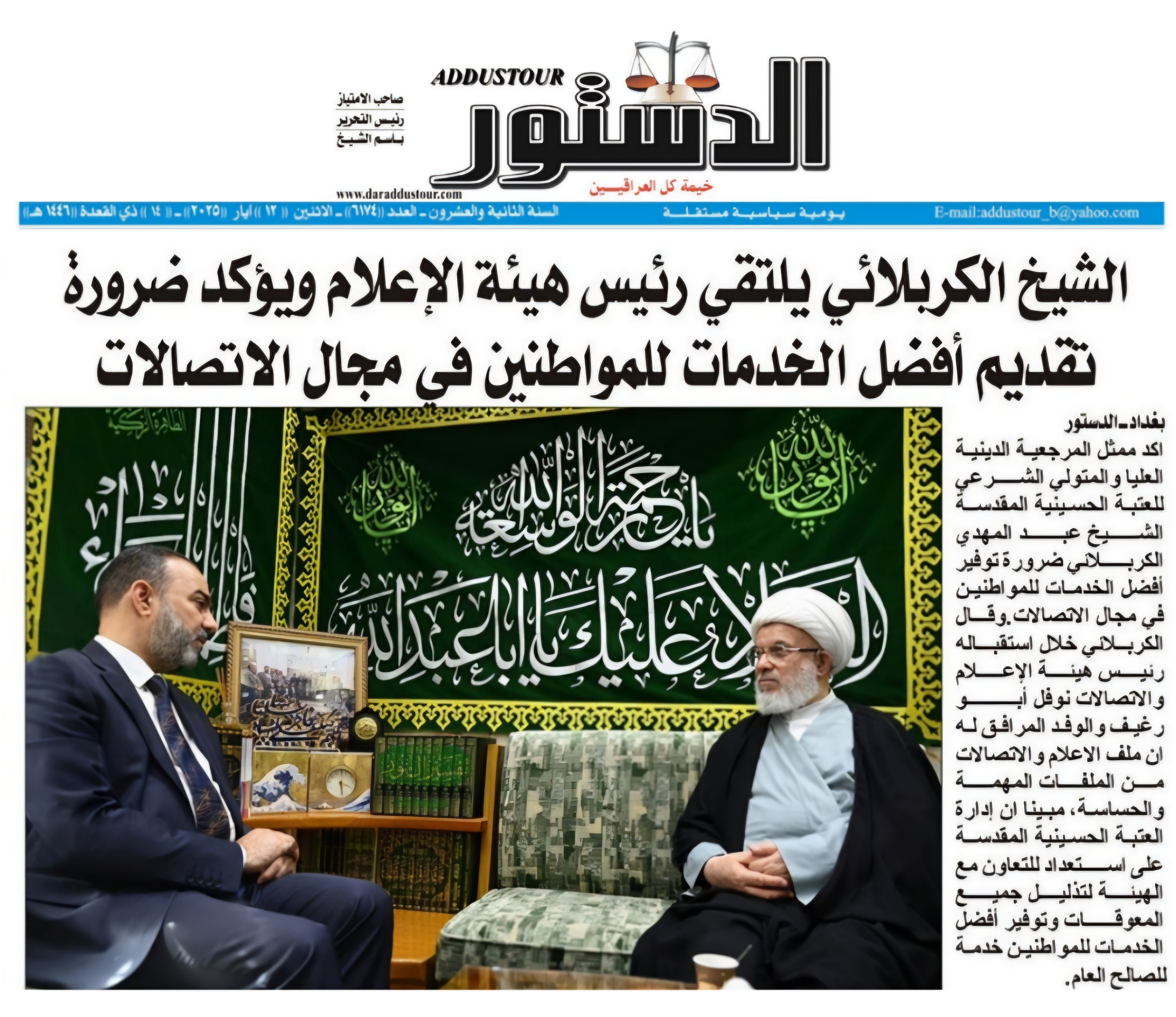 صحيفة الدستور .. الشيخ الكربلائي يلتقي رئيس هيأة الاعلام والاتصالات