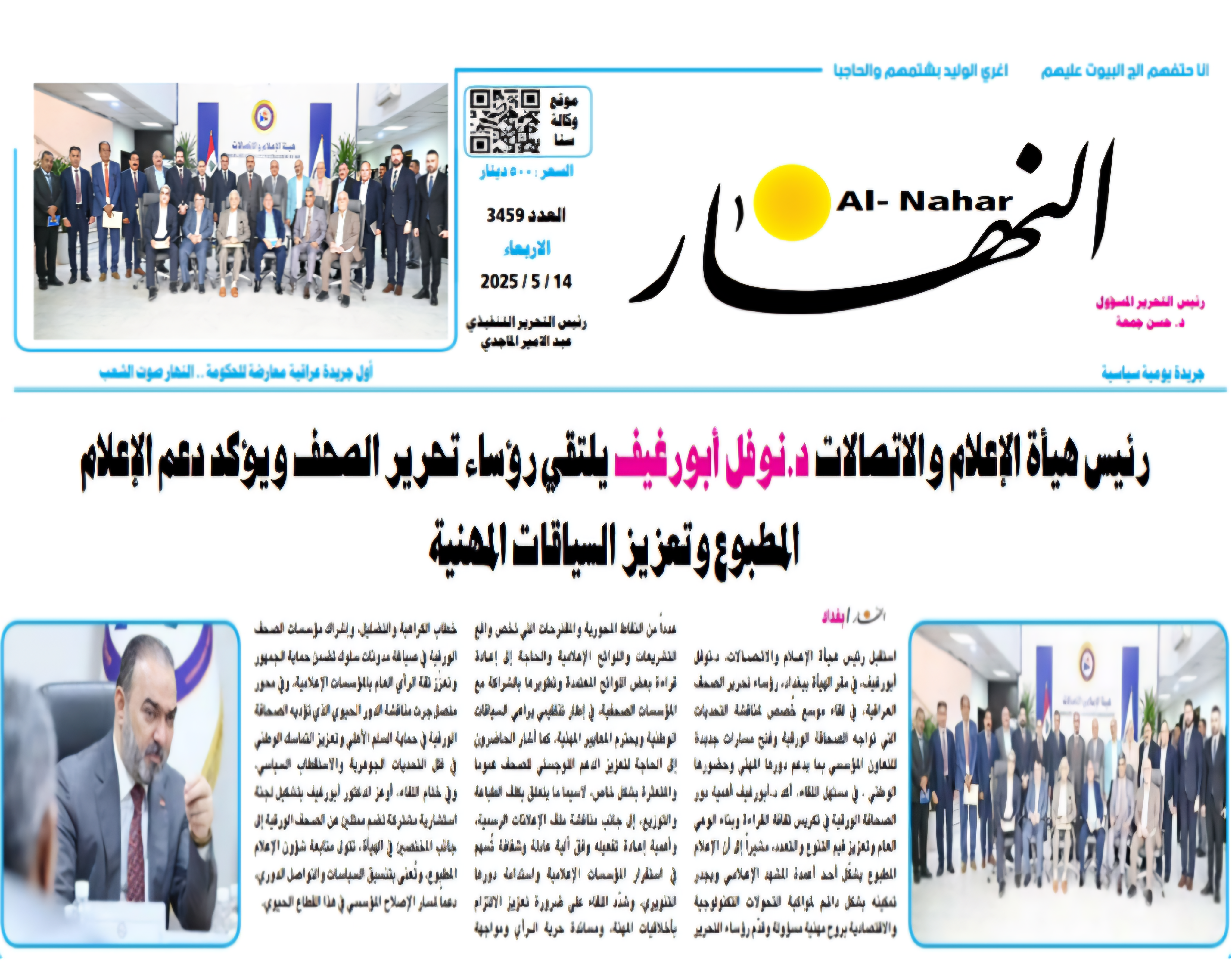 صحيفة النهار .. رئيس هيأة الاعلام والاتصالات يلتقي رؤساء تحرير الصحف