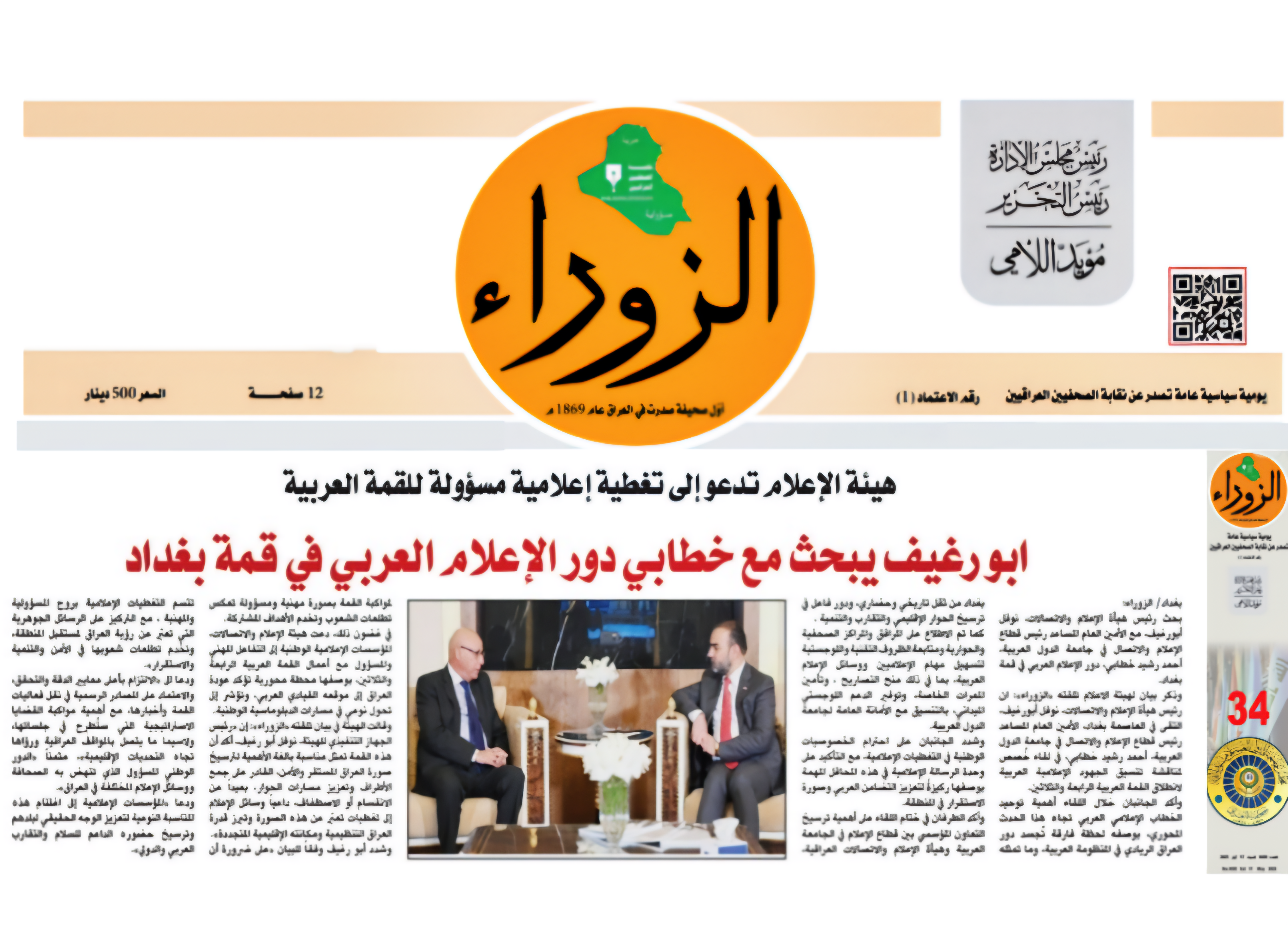 صحيفة الزوراء .. ابورغيف يبحث مع خطابي دور الاعلام العربي في قمة بغداد