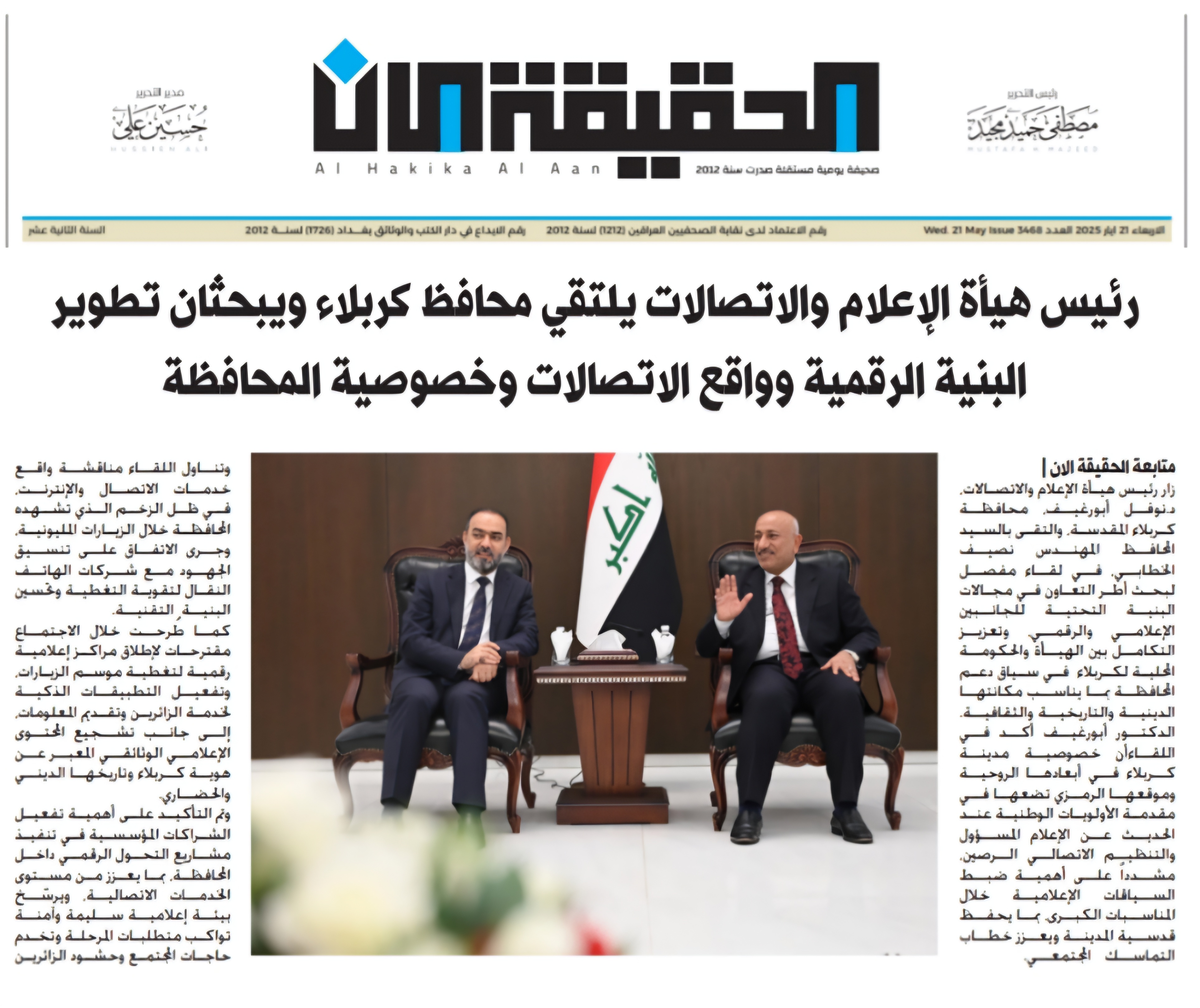 صحيفة الحقيقة الان .. رئيس هيأة الاعلام والاتصالات يلتقي محافظ النجف ويبحثان تطوير واقع الاتصالات
