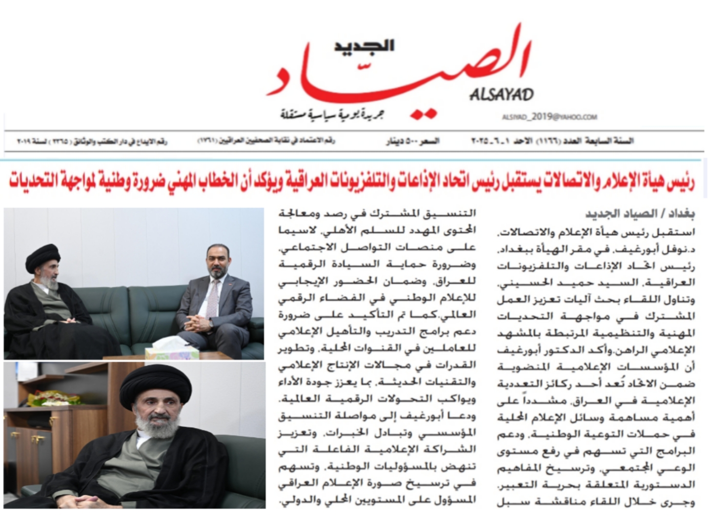 صحيفة الصياد.. رئيس هيأة الاعلام والاتصالات يستقبل رئيس اتحاد الاذاعات والتلفزيونات