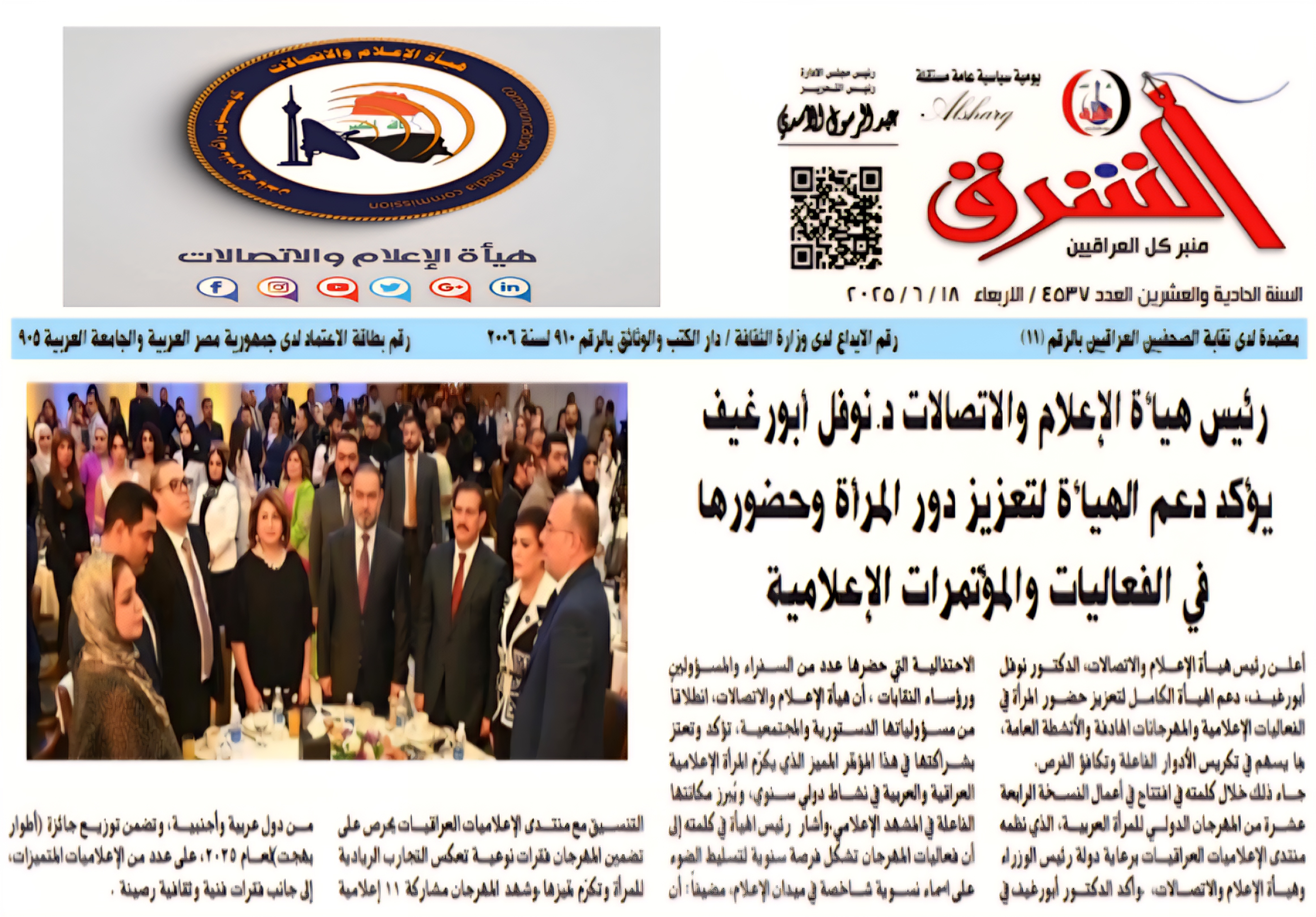 صحيفة الشرق .. رئيس هيأة الاعلام والاتصالات يؤكد دعم الهيأة لتعزيز دور المرأة