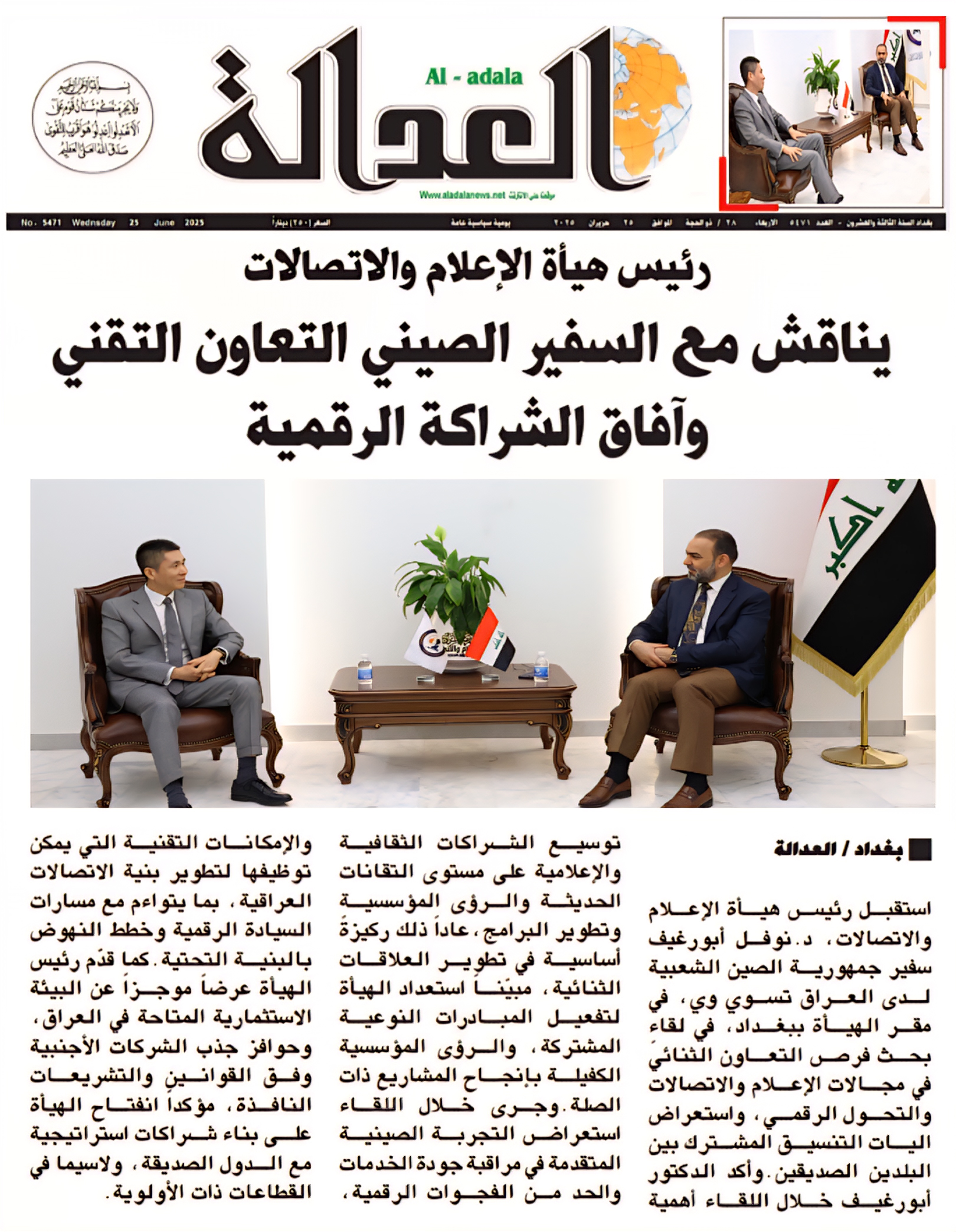 صحيفة العدالة .. رئيس هيأة الاعلام والاتصالات يناقش مع السفير الصيني التعاون التقني وآفاق الشراكة الرقمية