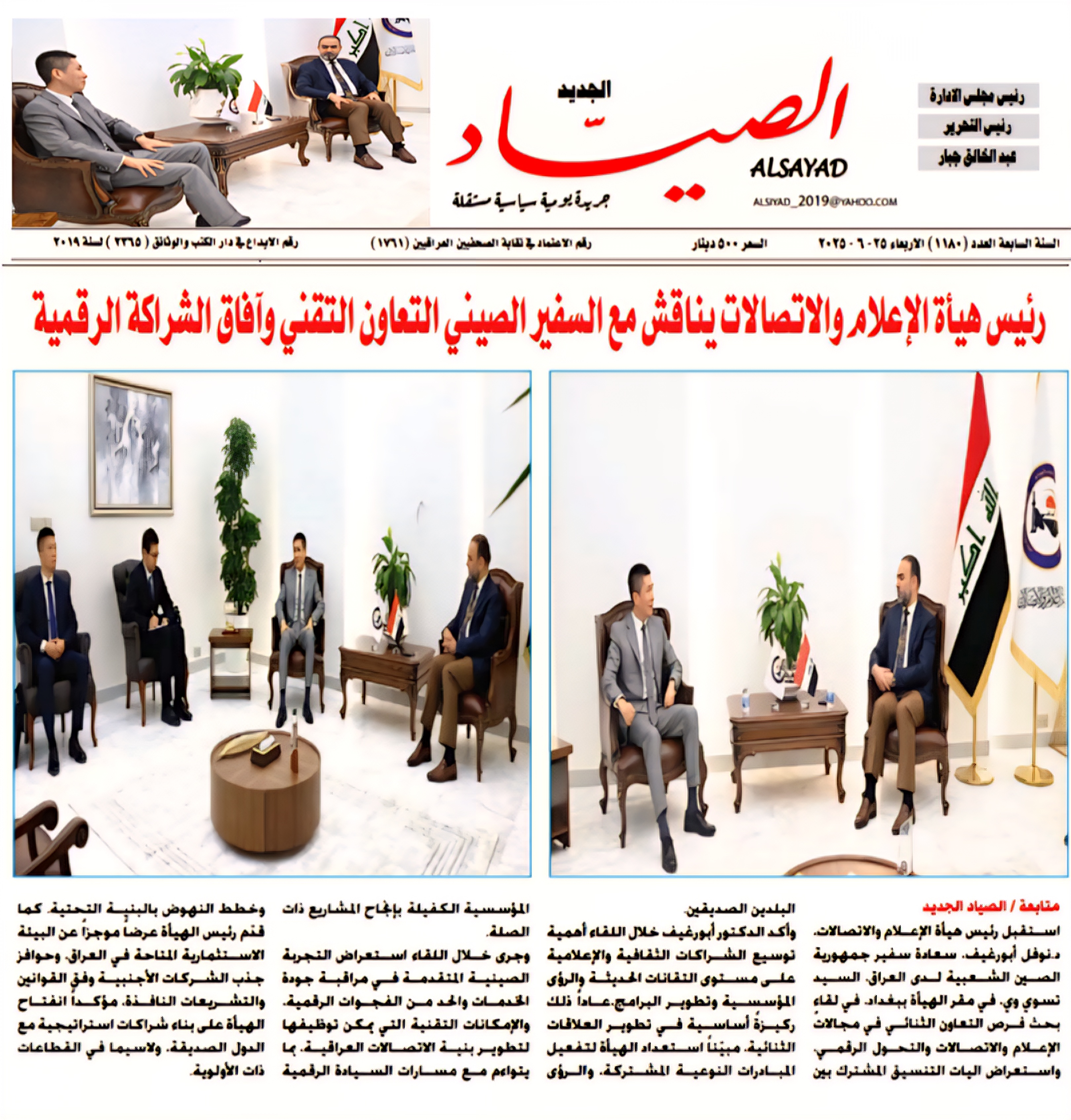 صحيفة الصياد .. رئيس هيأة الاعلام والاتصالات يناقش مع السفير الصيني التعاون التقني وآفاق الشراكة الرقمية
