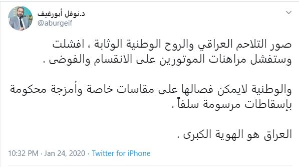 صور التلاحم العراقي والروح الوطنية الوثابة ، افشلت وستفشل مراهنات الموتورين على الانقسام والفوضى . والوطنية لايمكن فصالها على مقاسات خاصة وأمزجة محكومة بإسقاطات مرسومة سلفاً . العراق هو الهوية الكبرى .