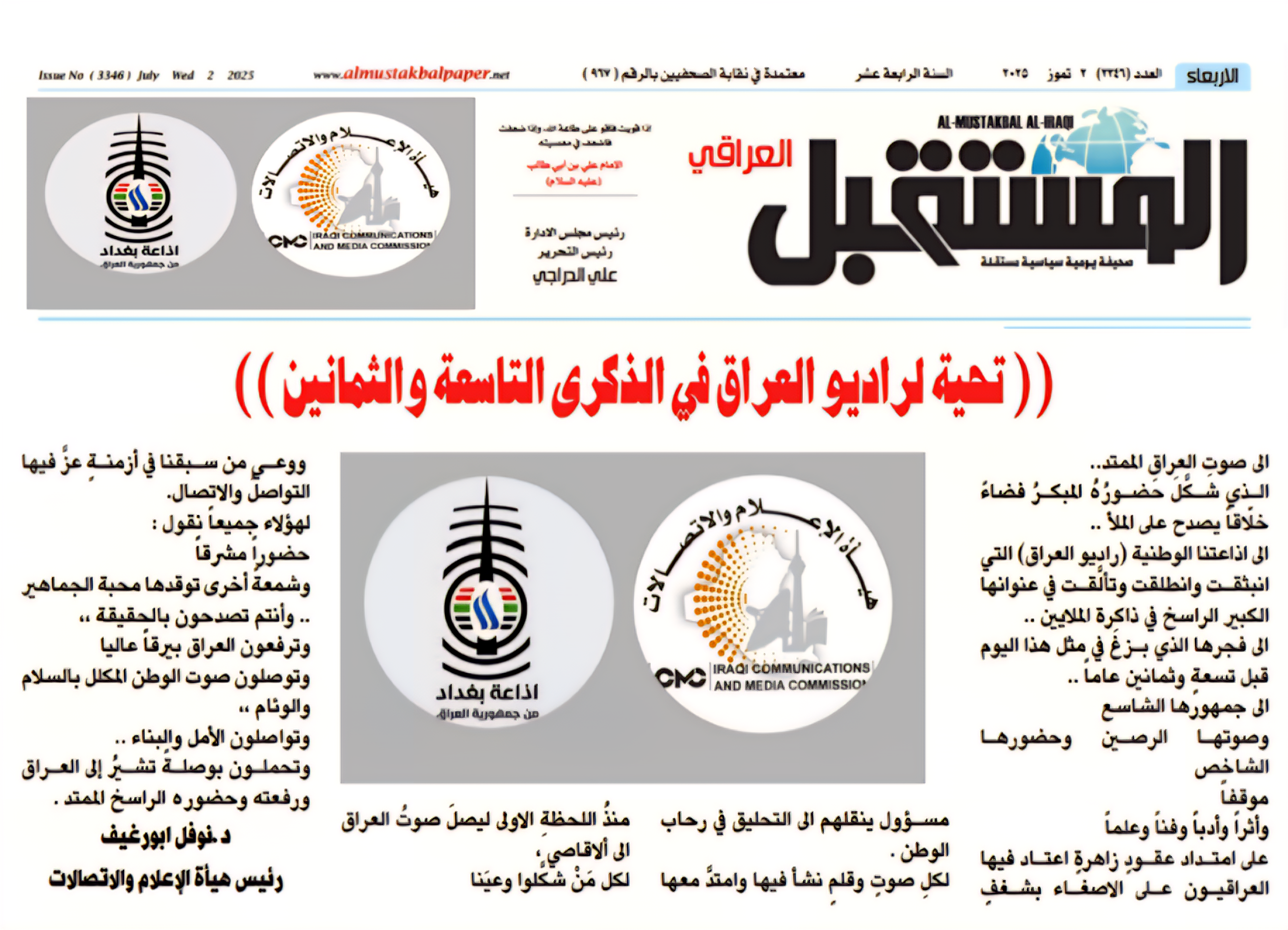 صحيفة المستقبل .. تحية لراديو العراق في الذكرى التاسعة والثمانين