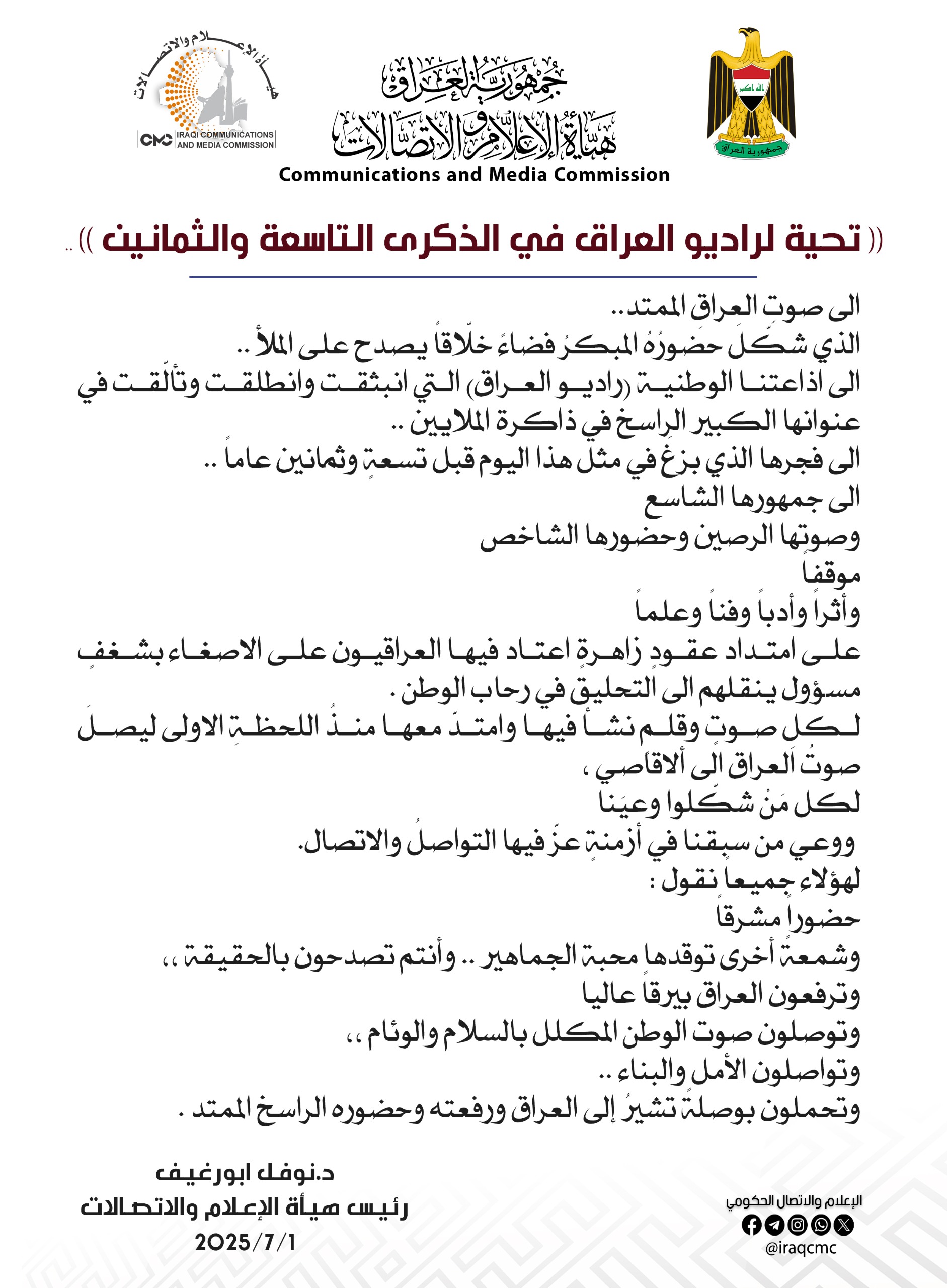 تهنئة .. تحية لراديو العراق في الذكرى التاسعة والثمانين