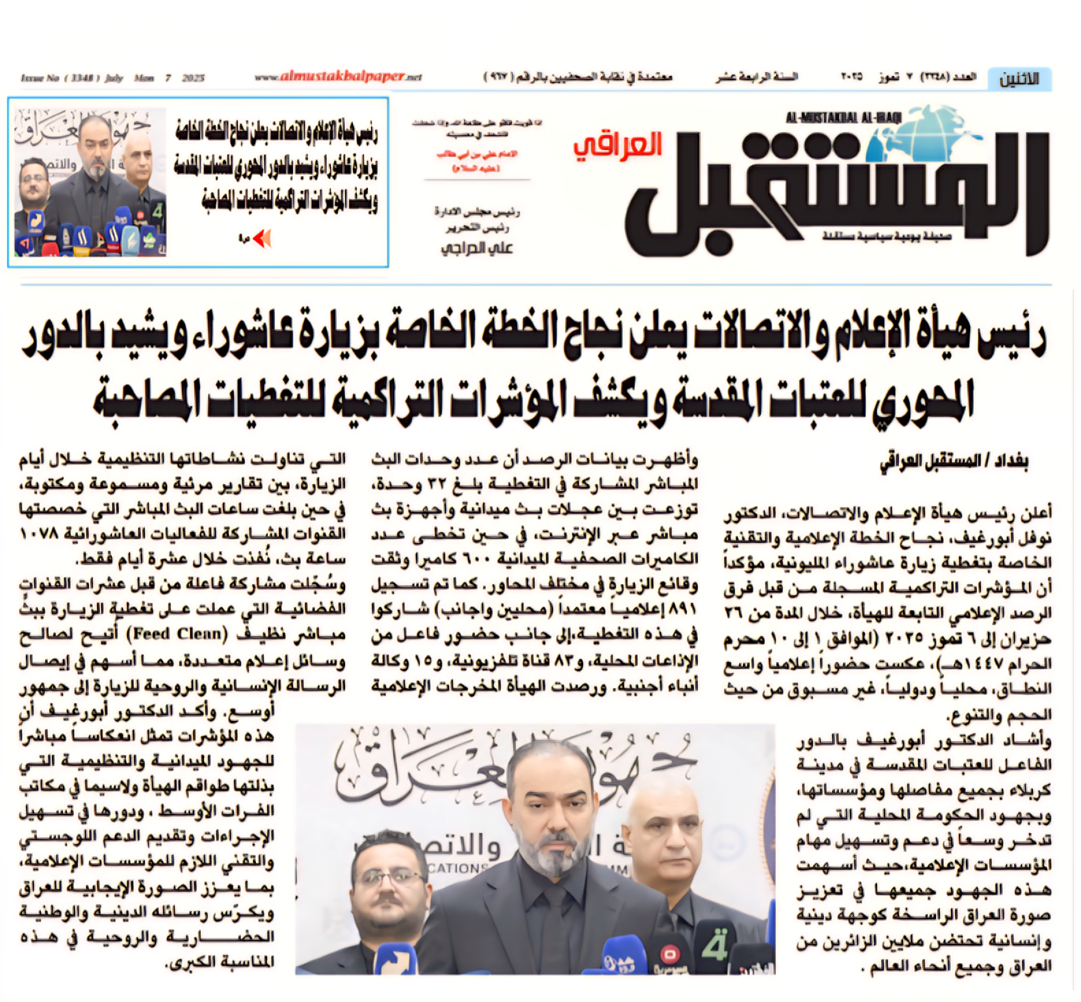 صحيفة المستقبل .. رئيس هيأة الاعلام والاتصالات يعلن نجاح الخطة الخاصة بزيارة عاشوراء