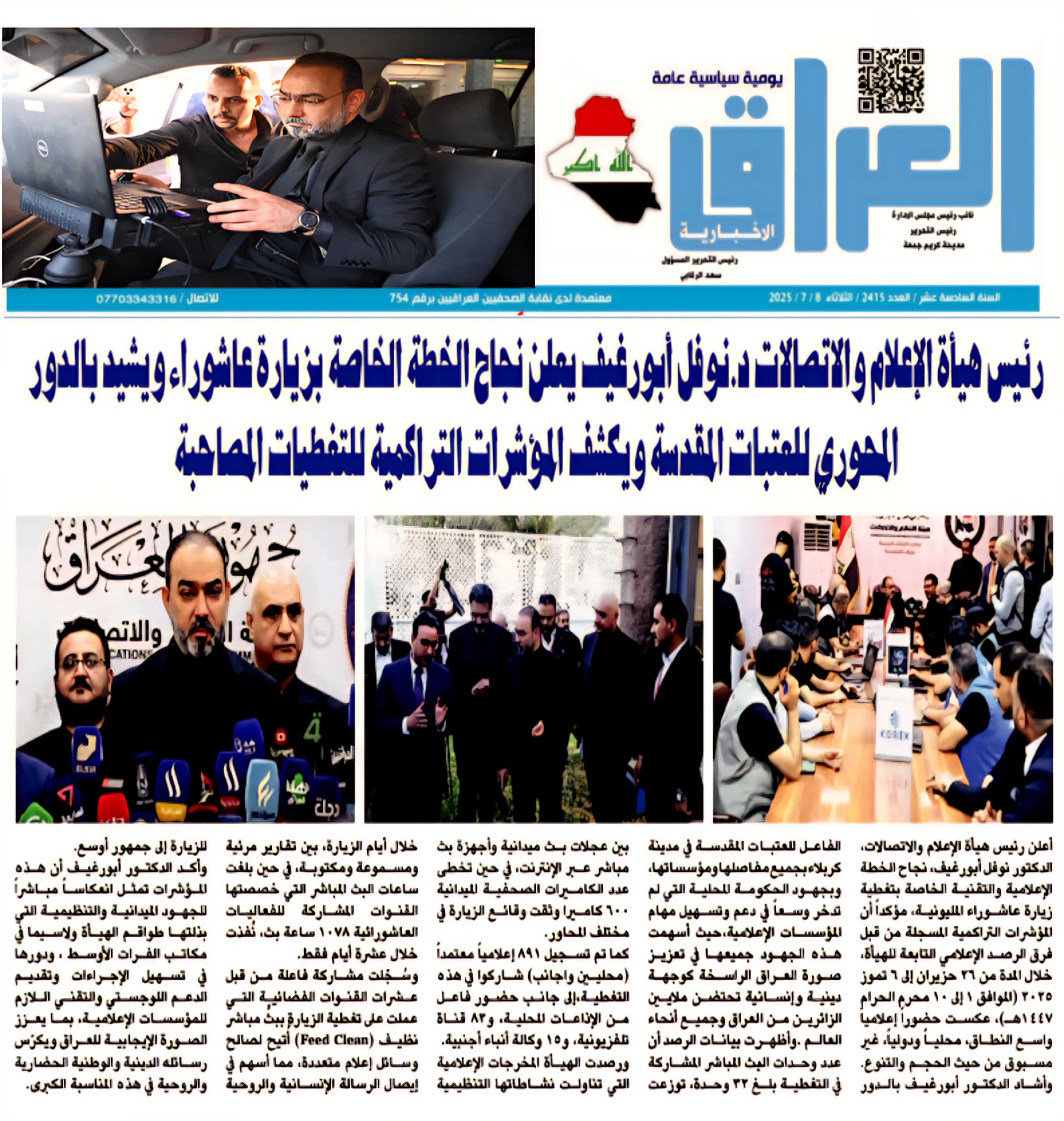 صحيفة العراق الاخبارية .. رئيس هيأة الاعلام والاتصالات يعلن نجاح الخطة الخاصة بزيارة عاشوراء