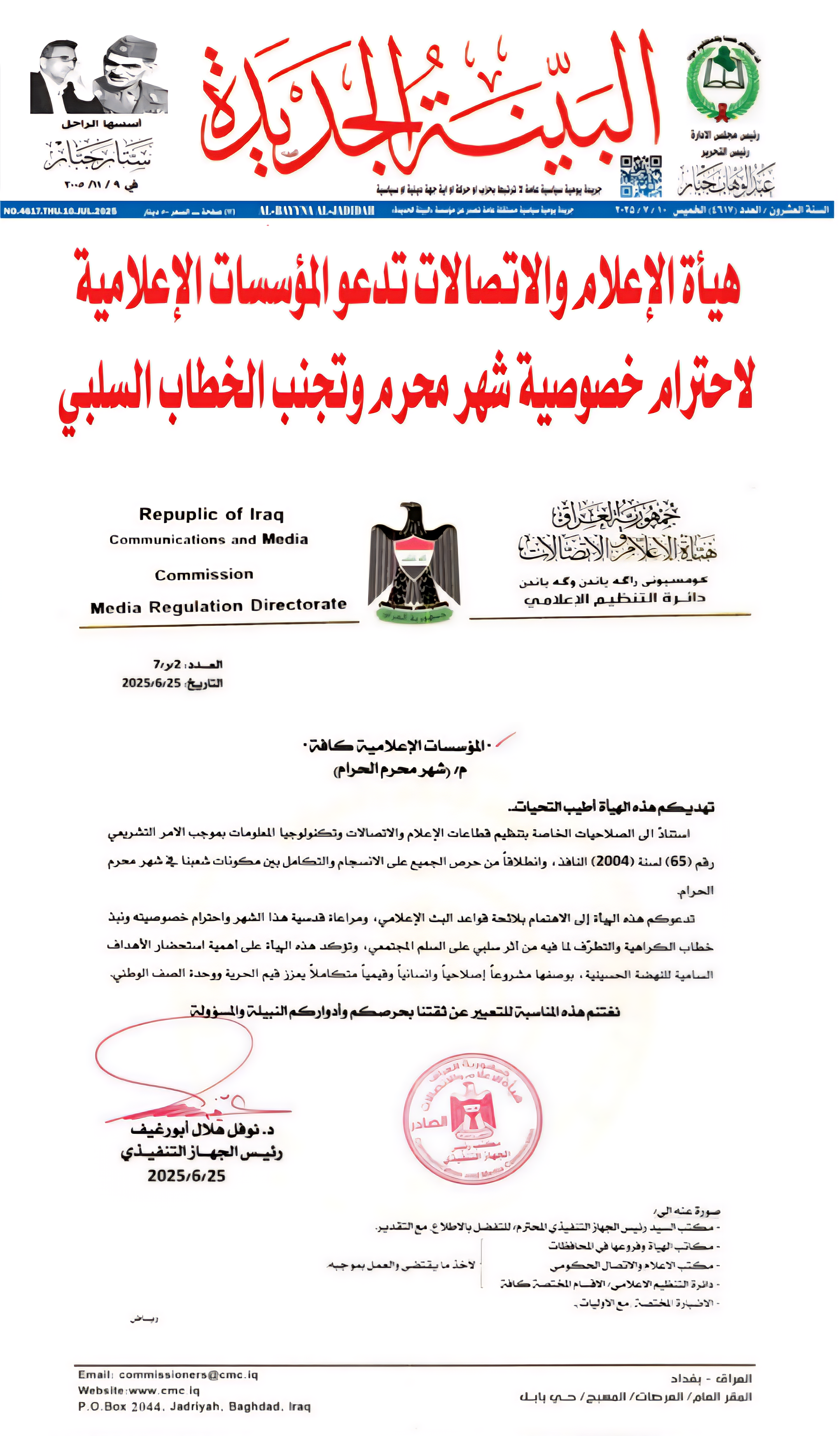صحيفة البينة الجديدة .. هيأة الاعلام والاتصالات تدعو المؤسسات الاعلامية لإحترام خصوصية شهر محرم وتجنب الخطاب السلبي
