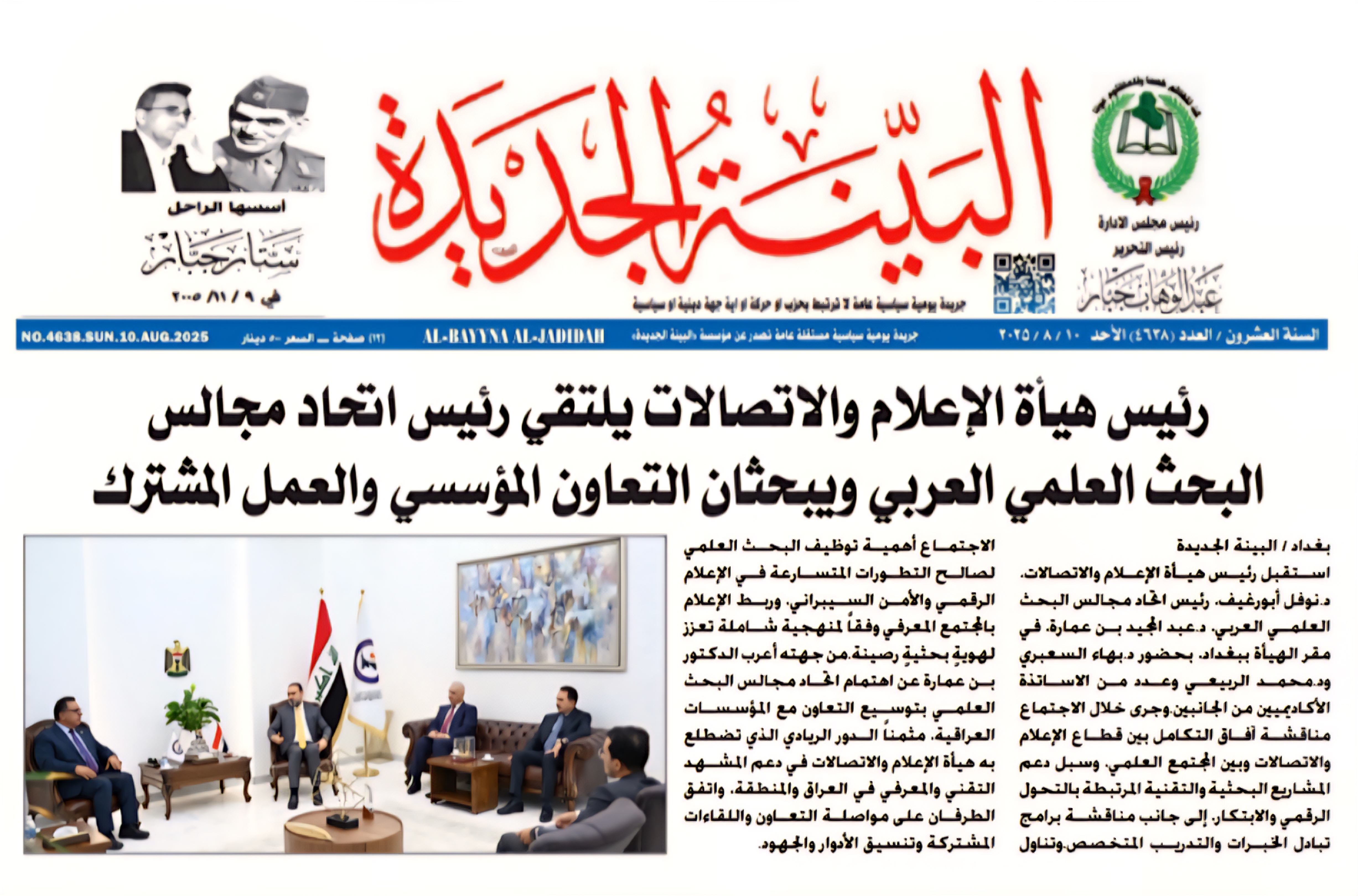 صحيفة البينة الجديدة .. رئيس هيأة الاعلام والاتصالات يلتقي رئيس اتحاد مجالس البحث العلمي العربي