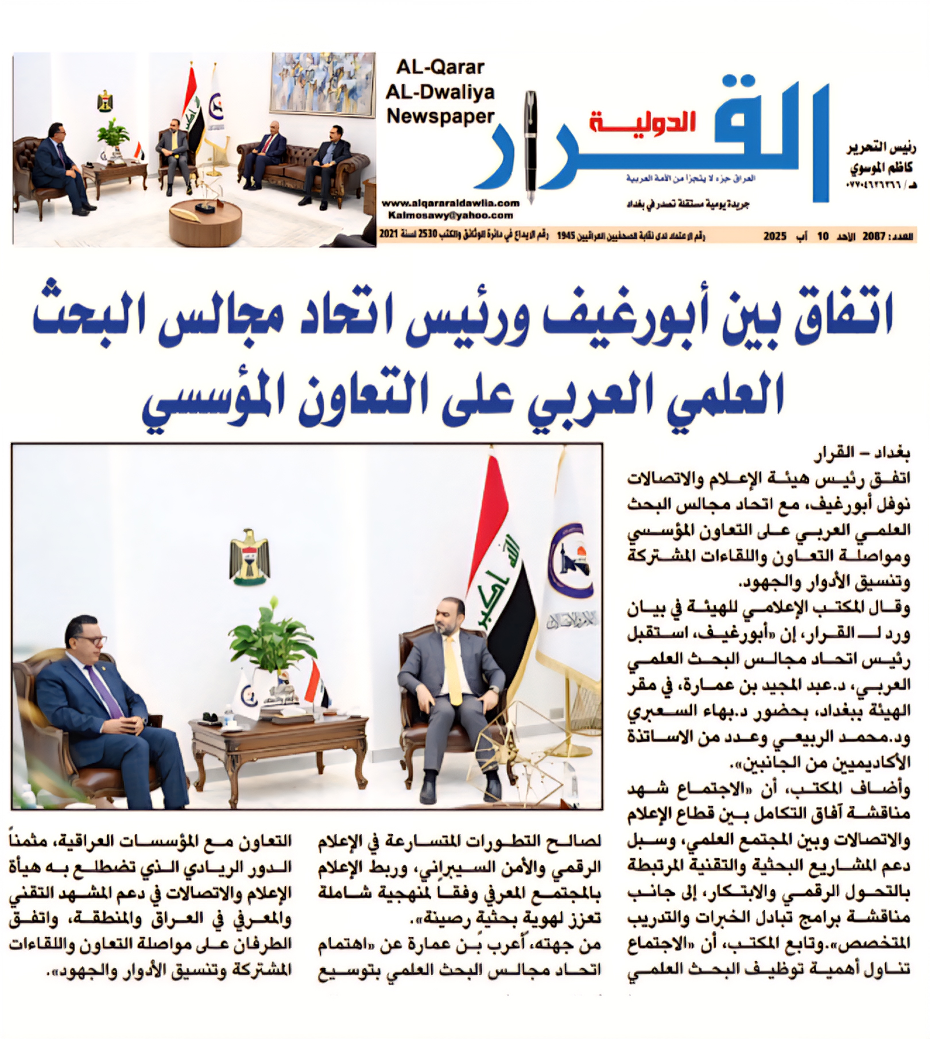 صحيفة القرار الدولية .. اتفاق بين ابورغيف ورئيس اتحاد مجالس البحث العلمي العربي على التعاون المؤسسي