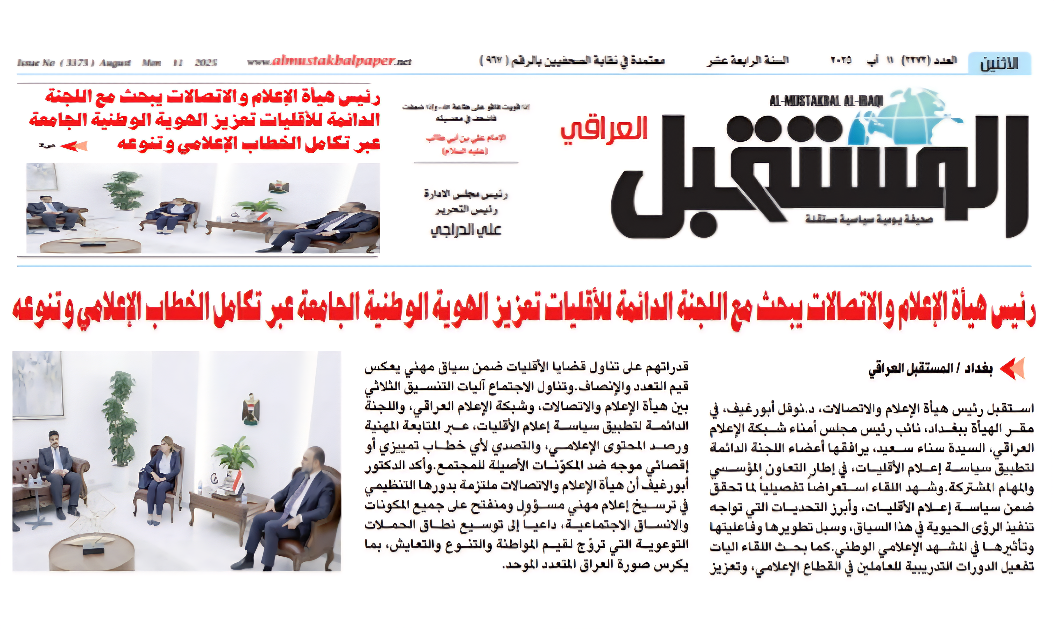 صحيفة المستقبل.. رئيس هيأة الاعلام والاتصالات يبحث مع اللجنة الدائمة للأقليات تعزيز الهوية الوطنية