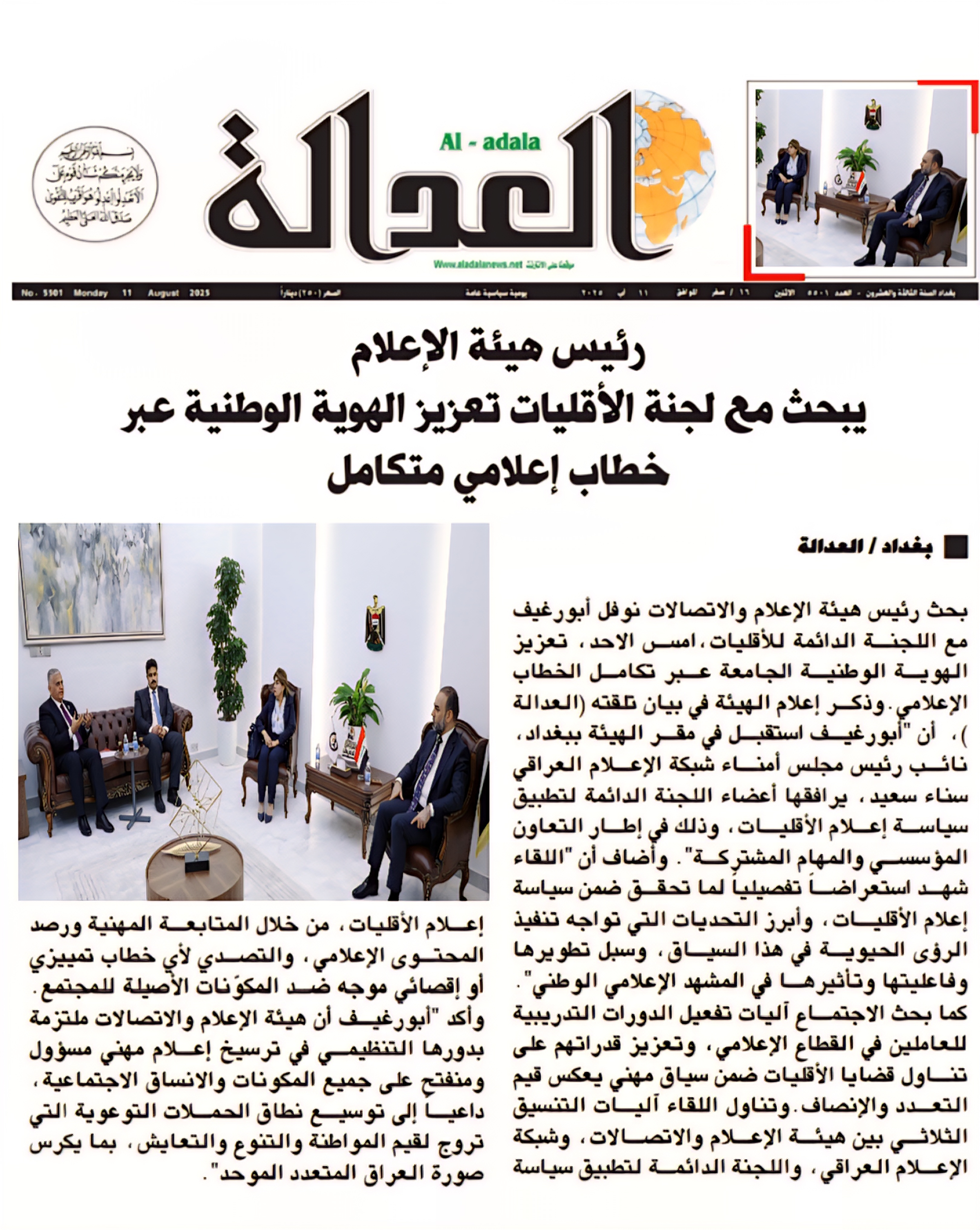 صحيفة العدالة .. رئيس هيأة الاعلام يبحث مع لجنة الاقليات تعزيز الهوية الوطنية عبر خطاب اعلامي متكامل