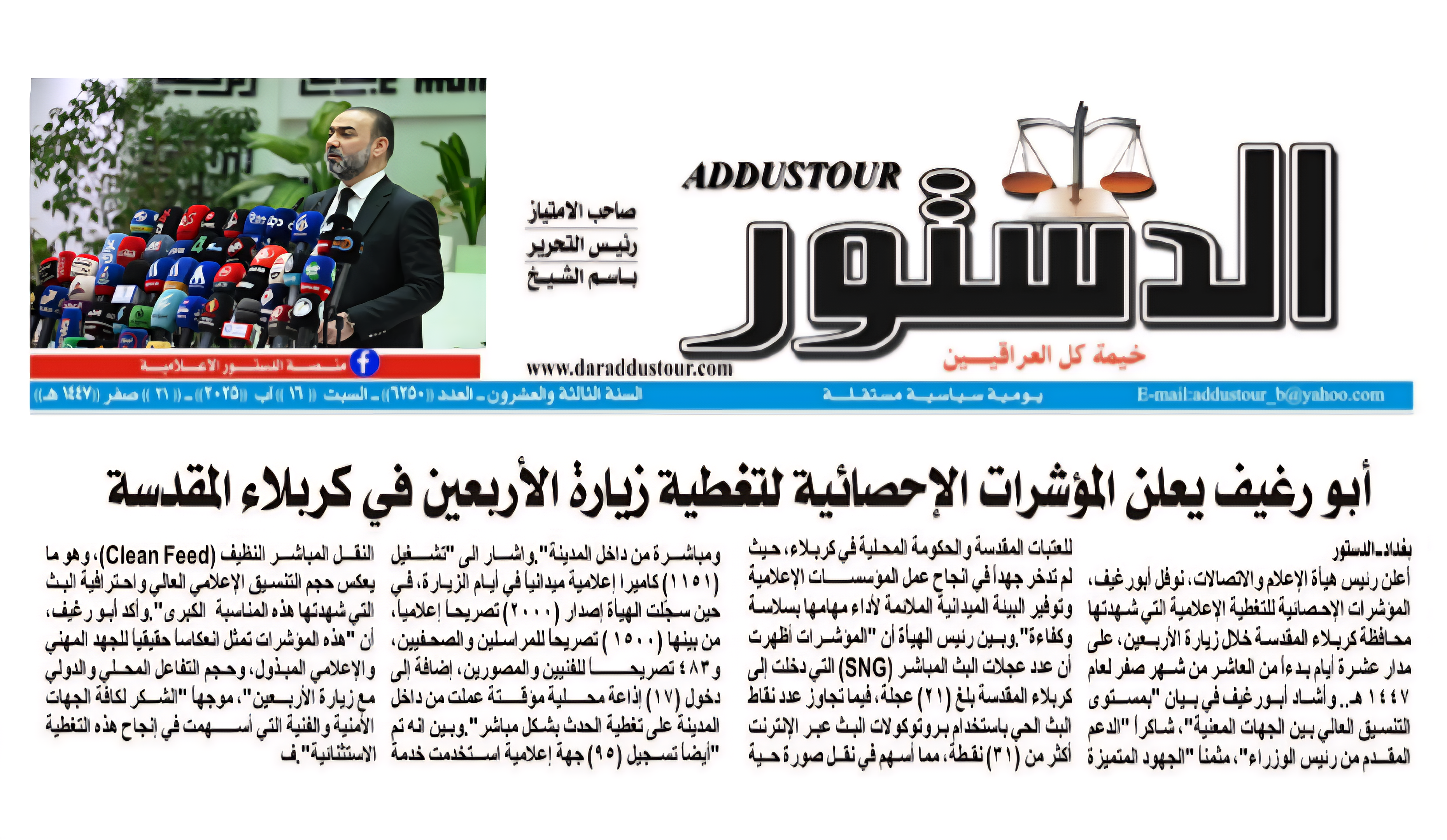 صحيفة الدستور .. ابورغيف يعلن المؤشرات الاحصائية لتغطية زيارة الاربعين في كربلاء