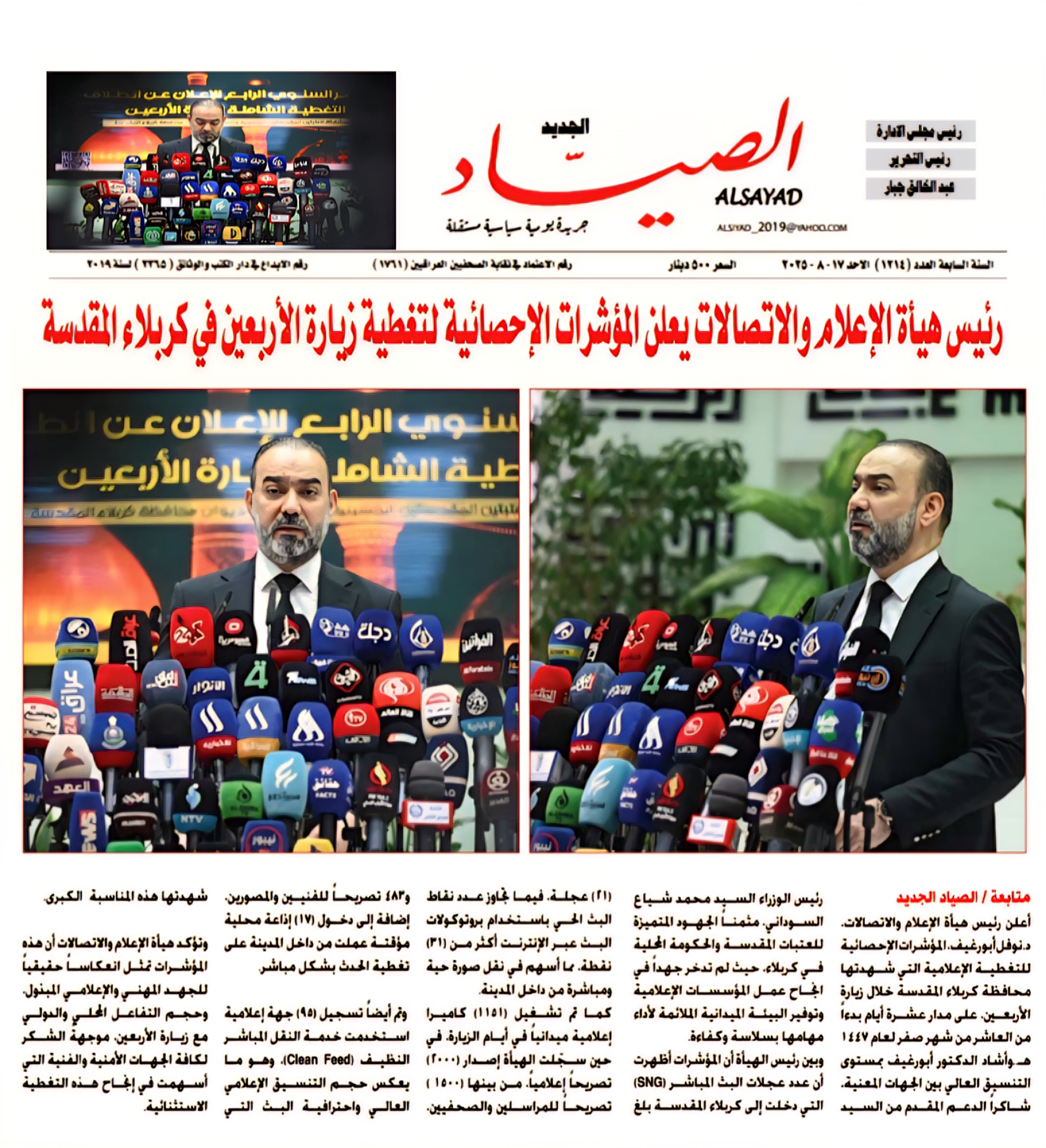 صحيفة الصياد .. رئيس هيأة الاعلام والاتصالات يعلن المؤشرات الاحصائية لتغطية زيارة الاربعين في كربلاء