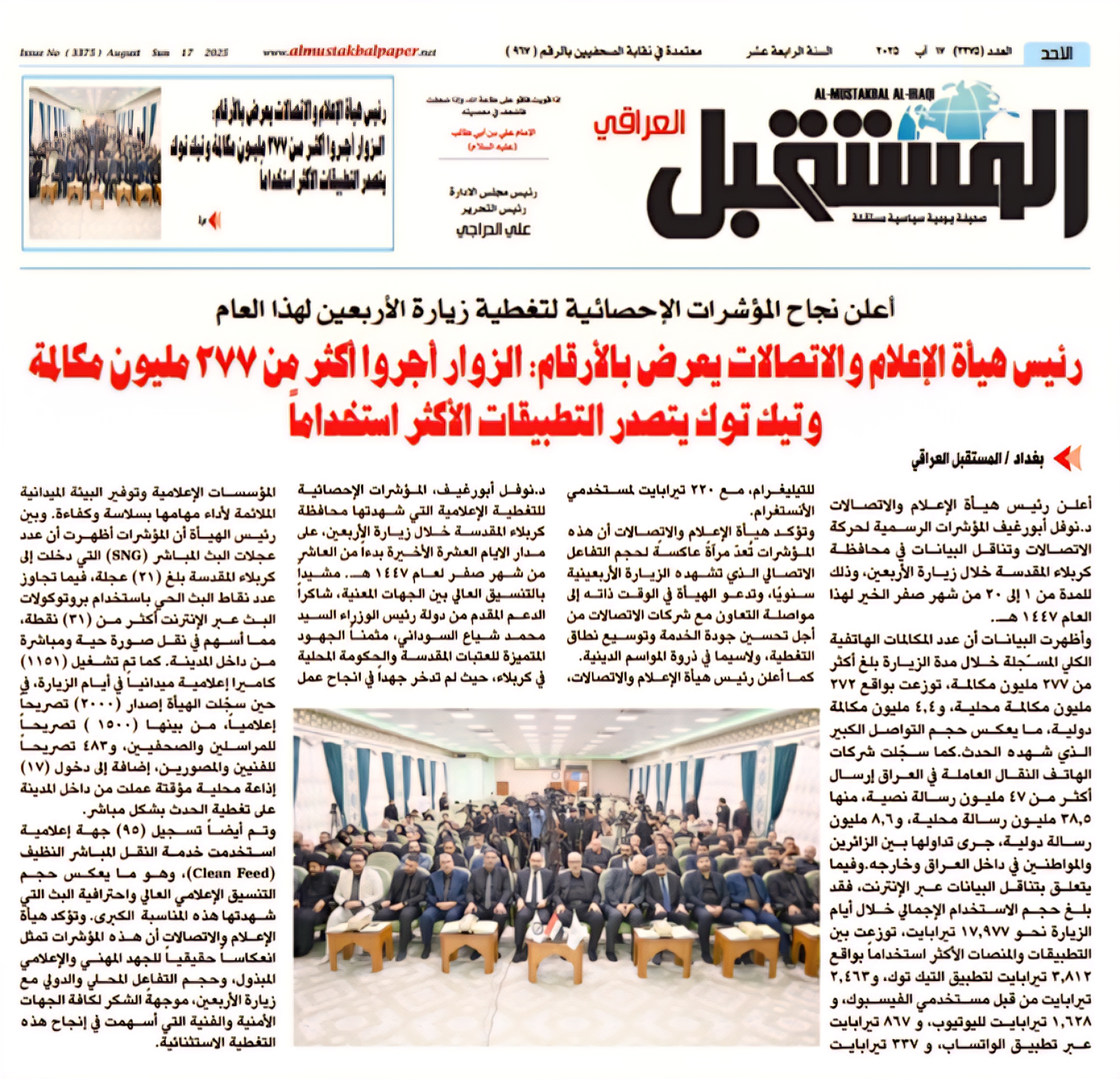 صحيفة المستقبل .. رئيس هيأة الاعلام والاتصالات الزوار اجروا اكثر من 277 مكالمة