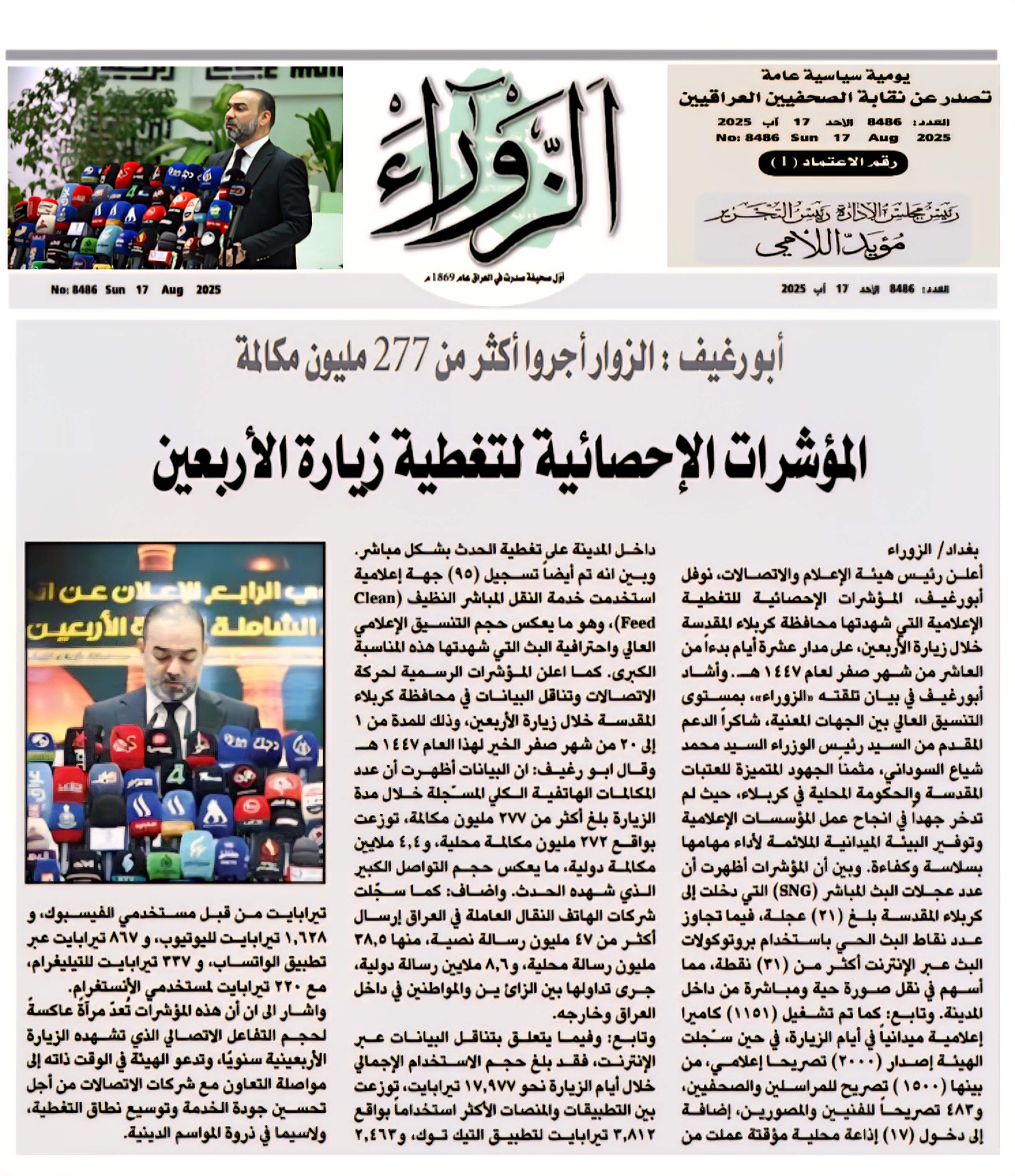 صحيفة الزوراء .. المؤشرات الاحصائية لتغطية زيارة الاربعين