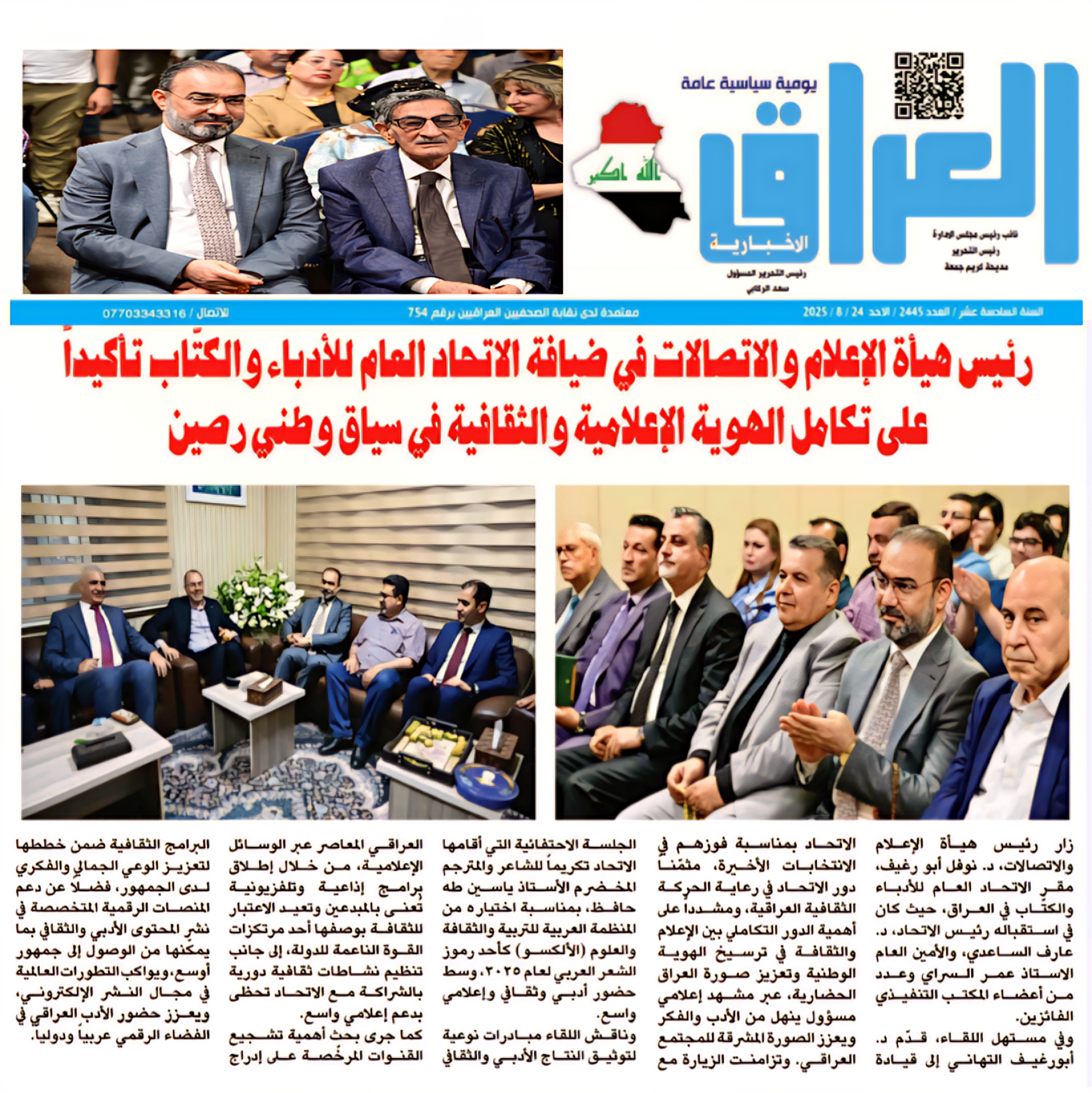 صحيفة العراق الاخبارية .. رئيس هيأة الاعلام والاتصالات في ضيافة الاتحاد العام للأدباء والكُتاب