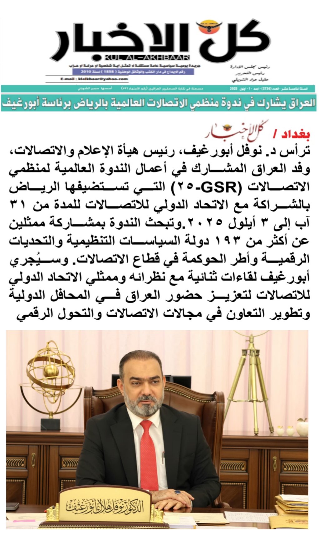 صحيفة كل الاخبار .. العراق يشارك في ندوة منظمي الاتصالات العالمية بالرياض برئاسة ابورغيف