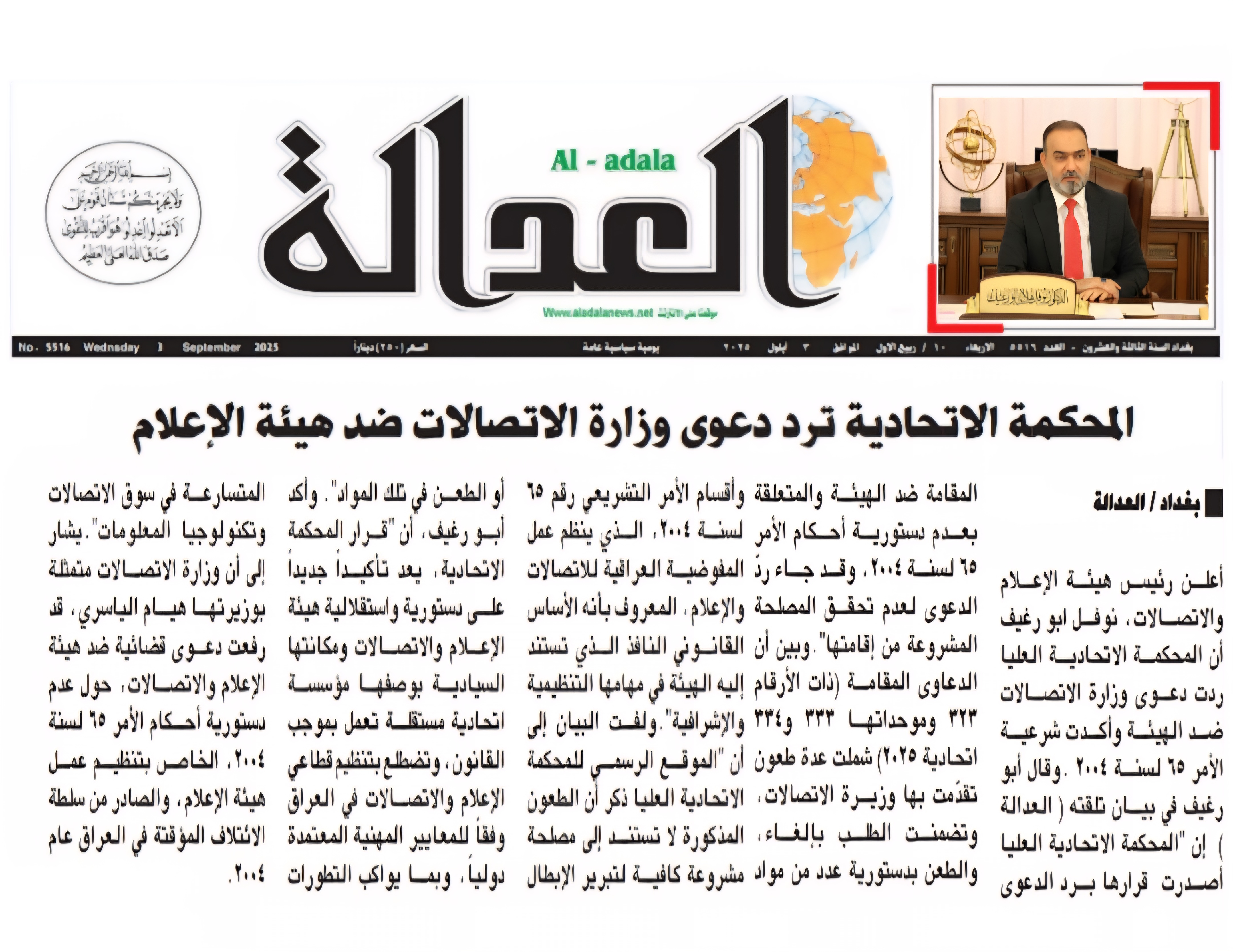 صحيفة العدالة .. المحكمة الاتحادية ترد دعوى وزارة الاتصالات ضد هيأة الاعلام