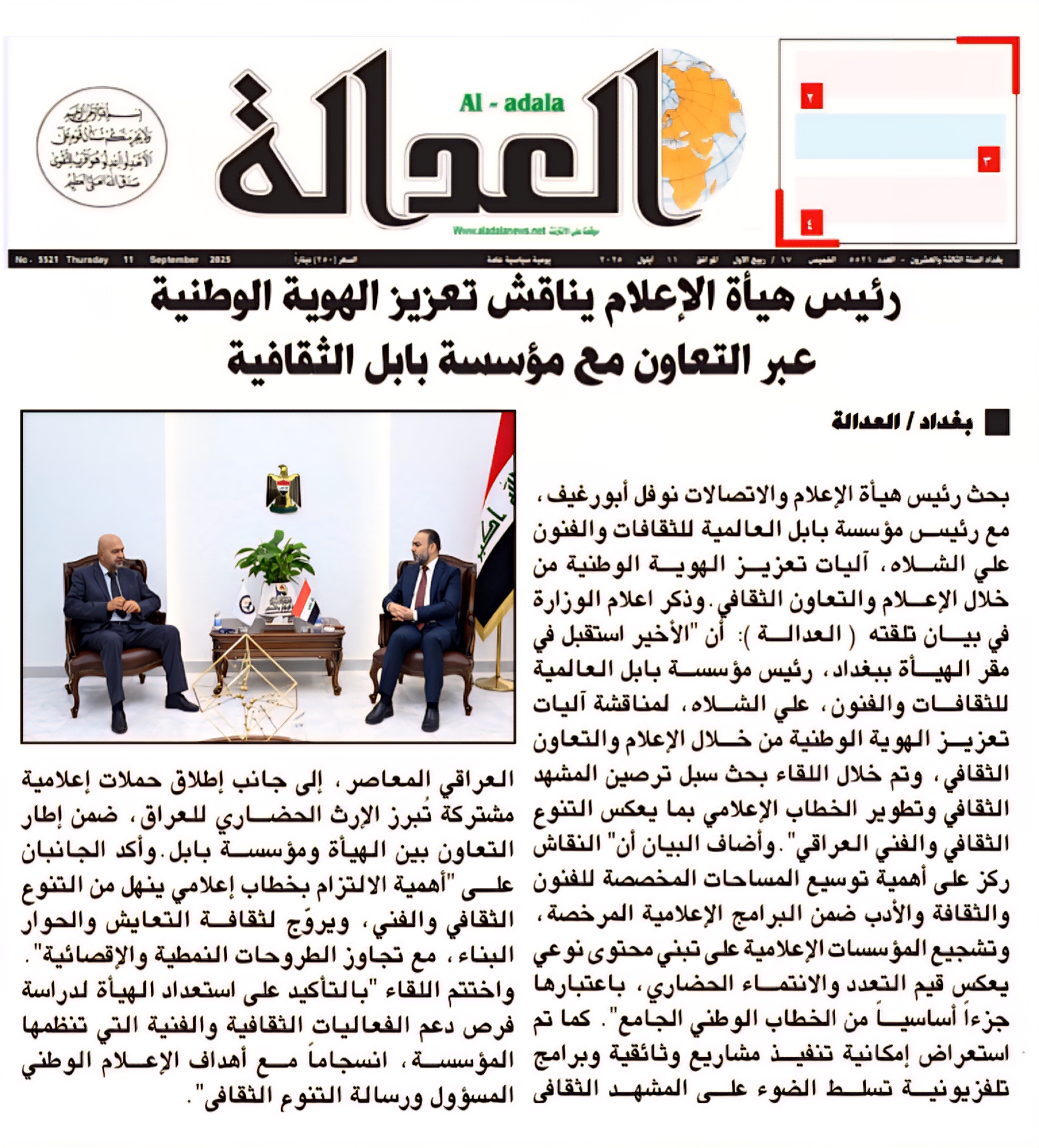 صحيفة العدالة .. رئيس هيأة الاعلام والاتصالات يناقش تعزيز الهوية الوطنية عبر التعاون مع مؤسسة بابل الثقافية