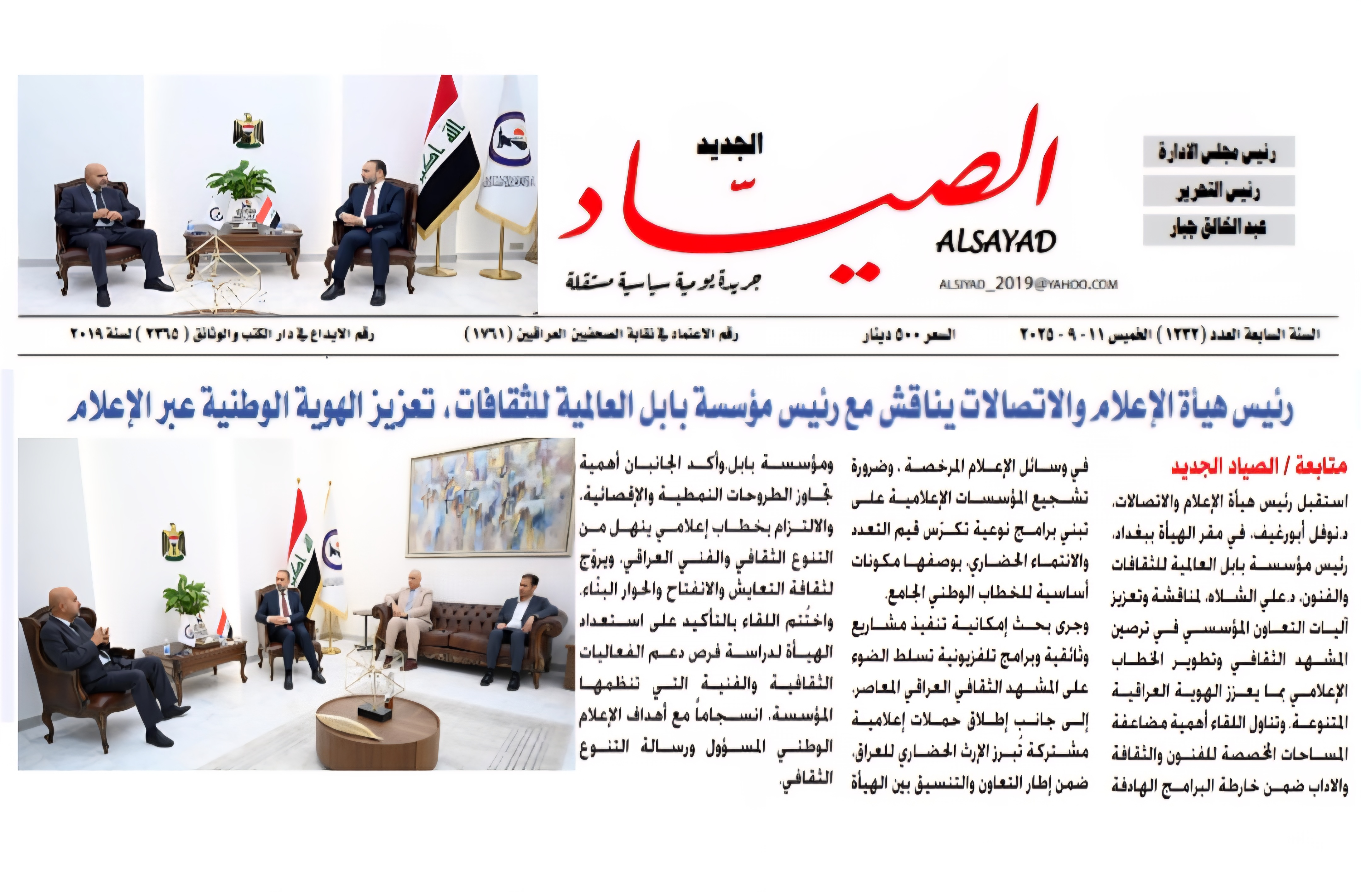 صحيفة الصياد .. رئيس هيأة الاعلام والاتصالات يناقش مع رئيس مؤسسة بابل تعزيز الهوية الوطنية عبر الاعلام