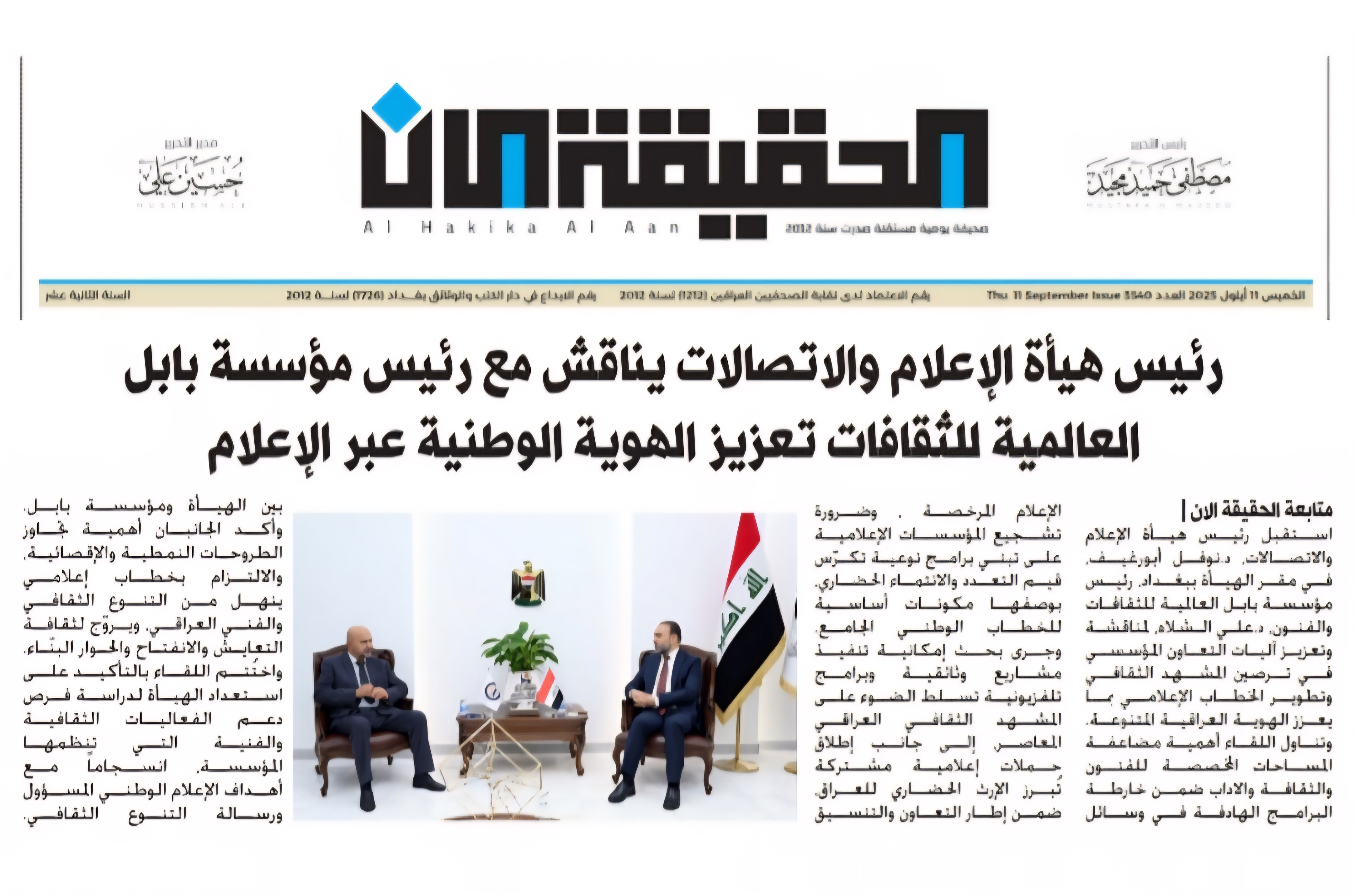 صحيفة الحقيقة الان .. رئيس هيأة الاعلام والاتصالات يناقش مع رئيس مؤسسة بابل تعزيز الهوية الوطنية عبر الاعلام