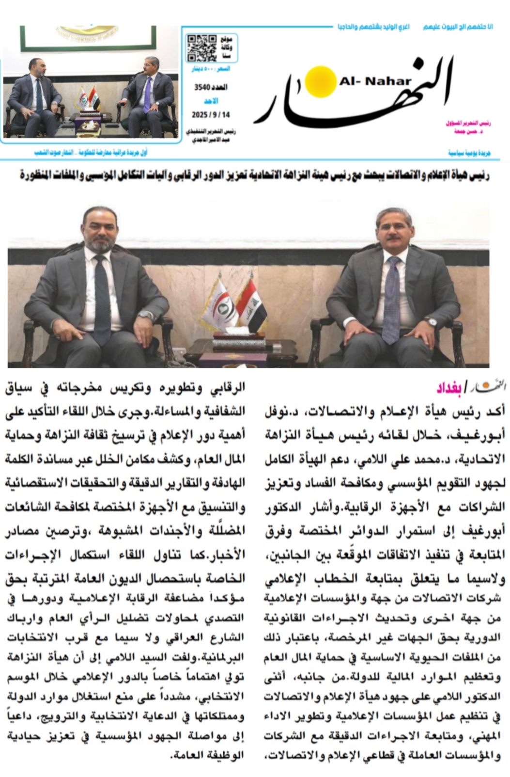صحيفة النهار .. رئيس هيأة الاعلام والاتصالات يبحث مع رئيس هيأة النزاهة الاتحادية تعزيز الدور الرقابي