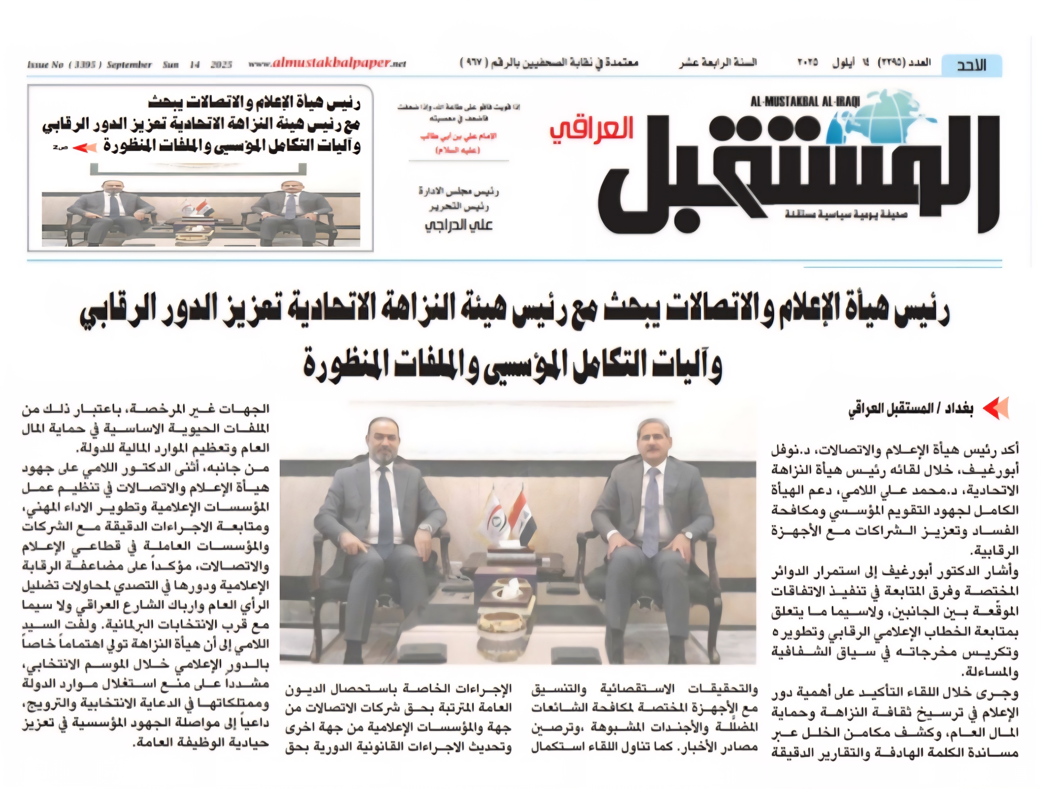 صحيفة المستقبل .. رئيس هيأة الاعلام والاتصالات يبحث مع رئيس هيأة النزاهة الاتحادية تعزيز الدور الرقابي