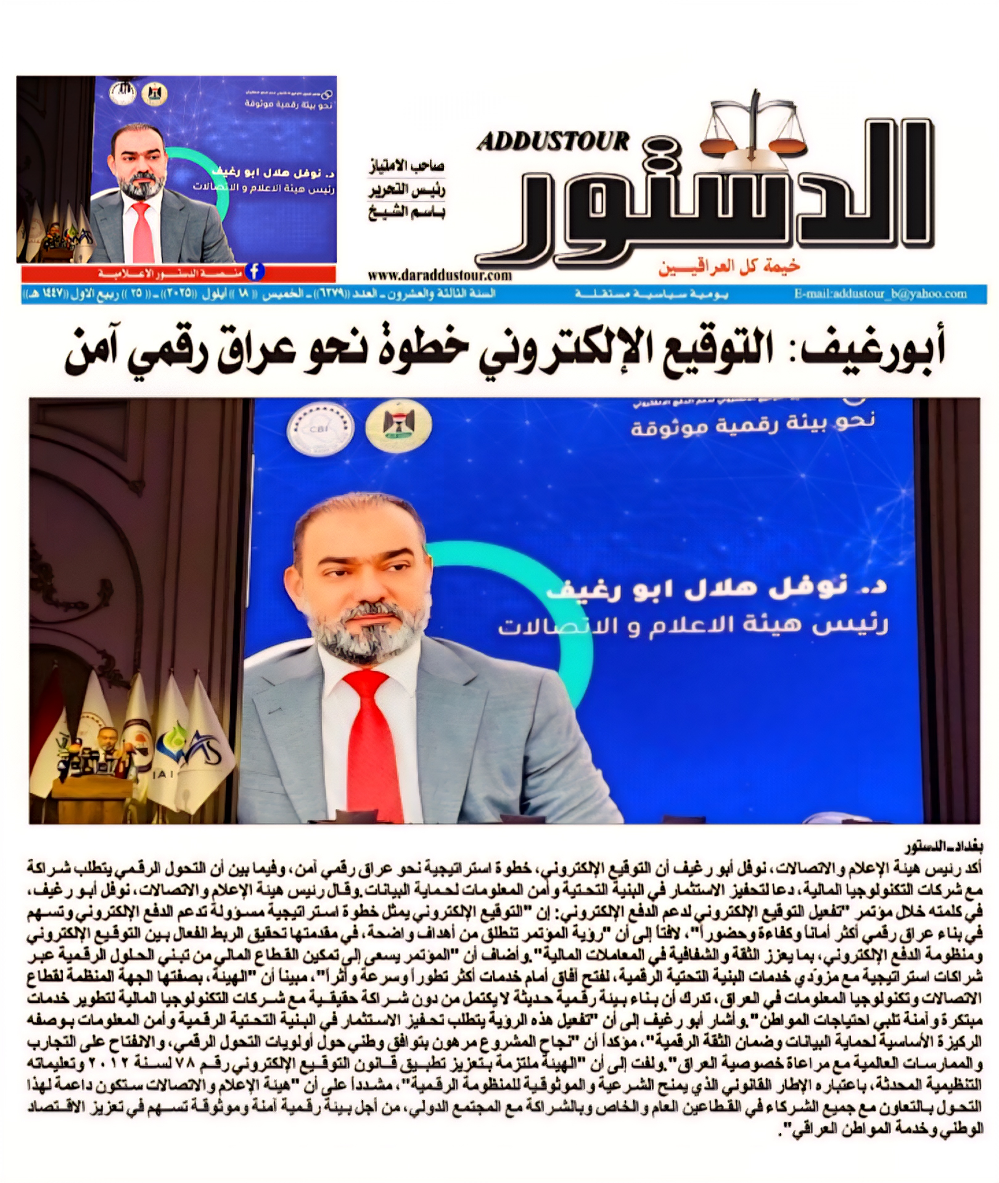 صحيفة الدستور .. ابورغيف : التوقيع الالكتروني خطوة نحو عراق رقمي آمن