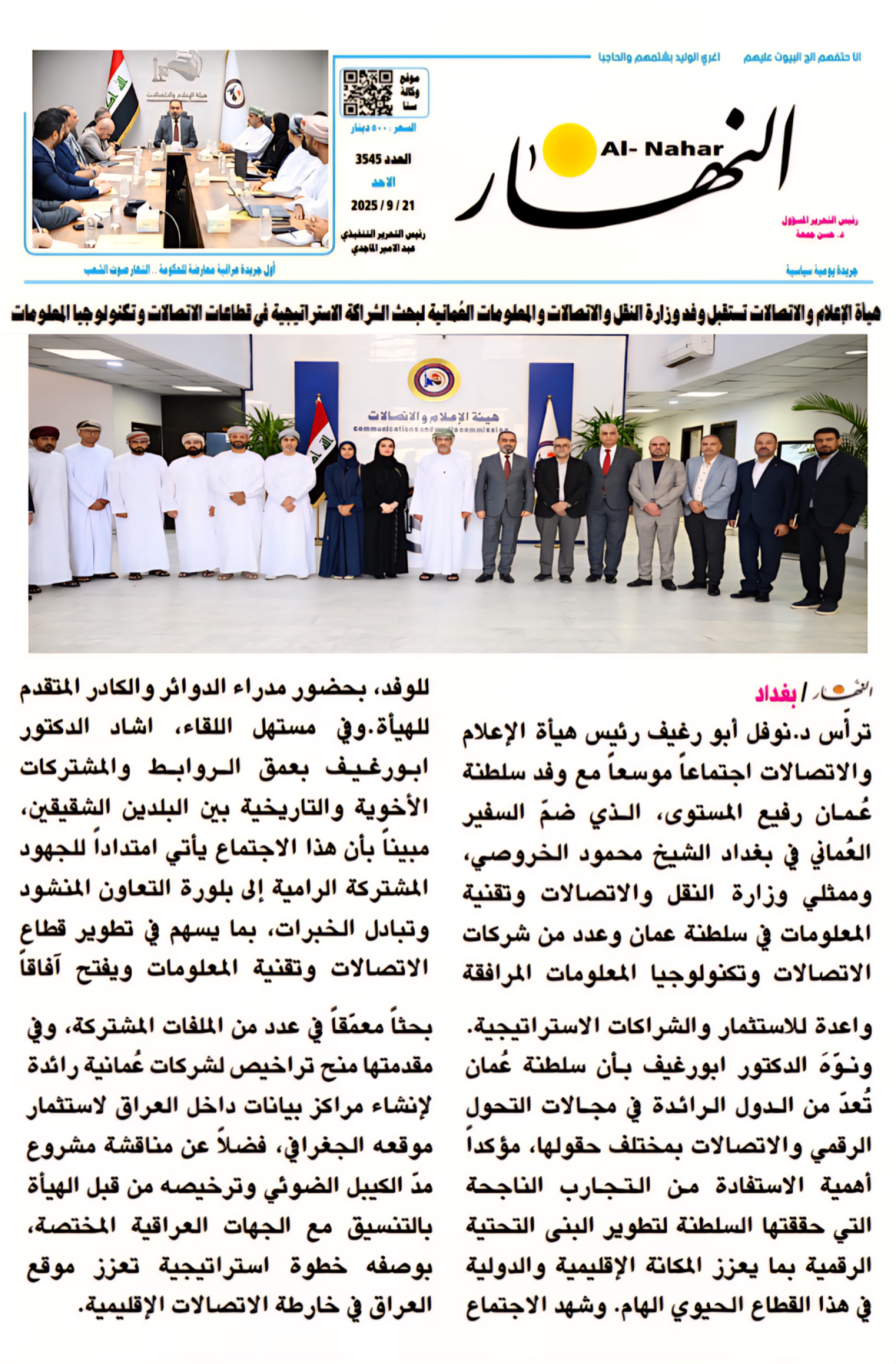 صحيفة النهار .. هيأة الاعلام والاتصالات تستقبل وفد وزارة النقل والاتصالات العماني