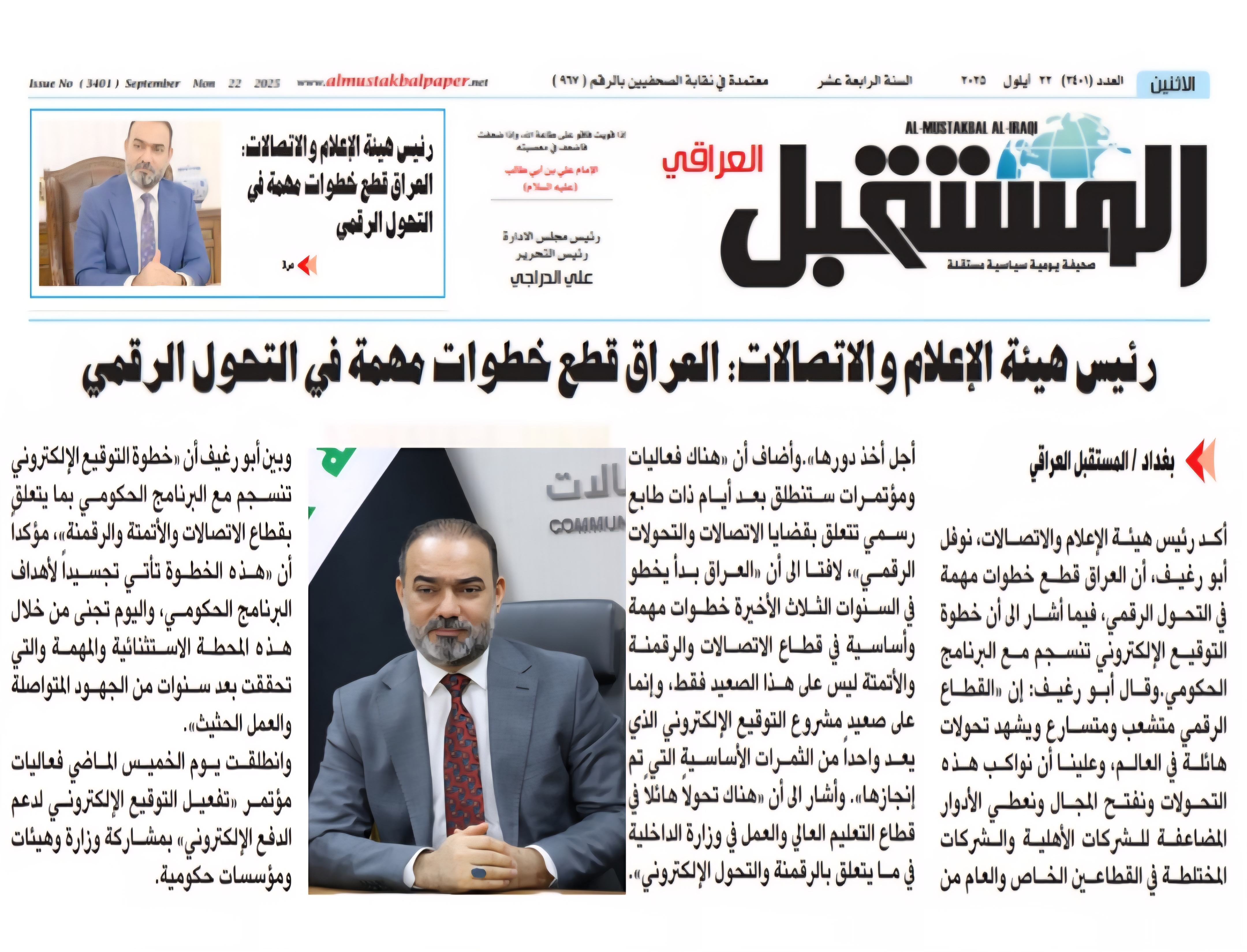 صحيفة المستقبل .. رئيس هيأة الاعلام والاتصالات : العراق قطع خطوات مهمة في التحول الرقمي