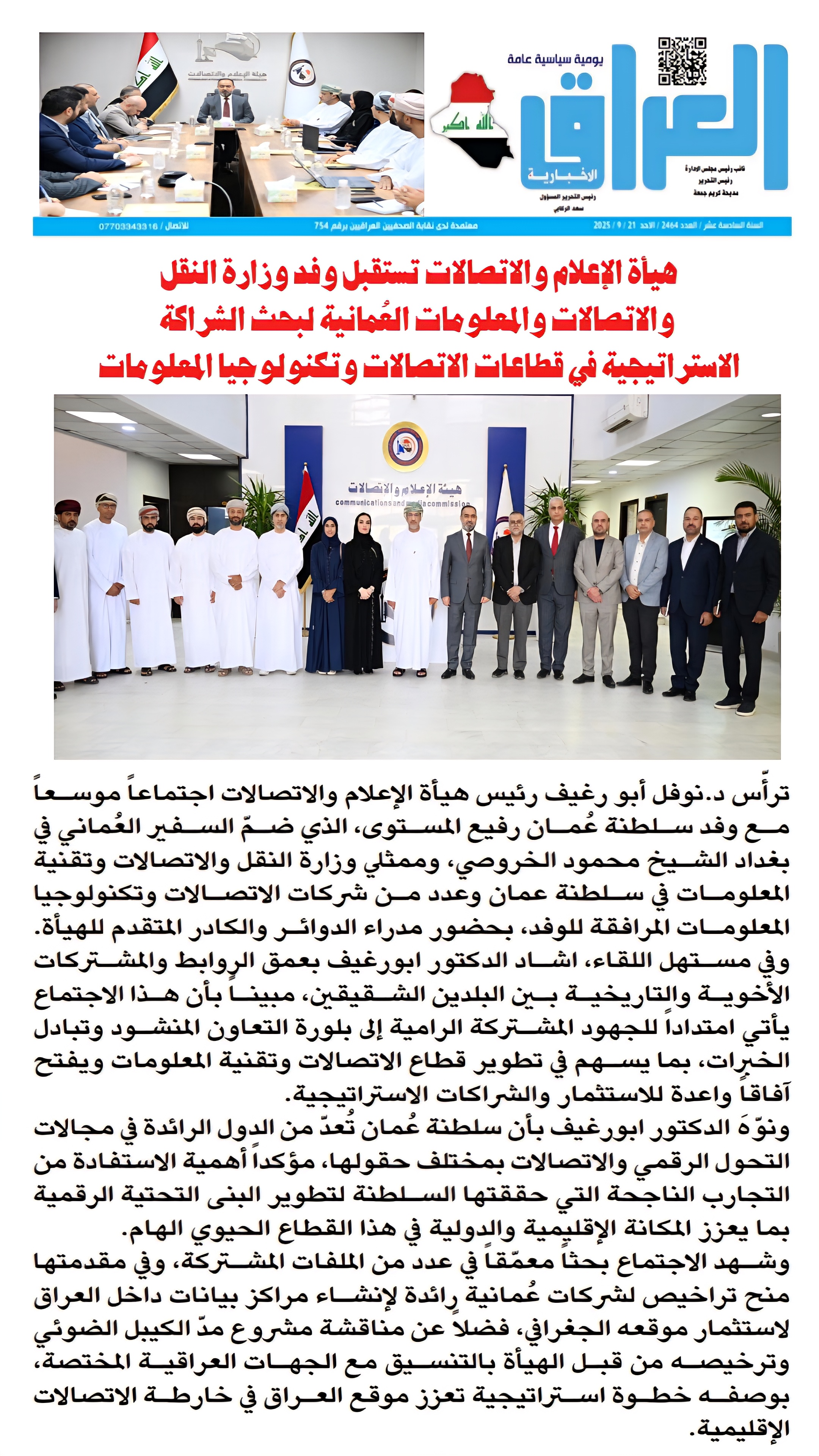 صحيفة العراق الاخبارية .. هيأة الاعلام والاتصالات تستقبل وفد وزارة النقل والاتصالات والمعلومات العمانية