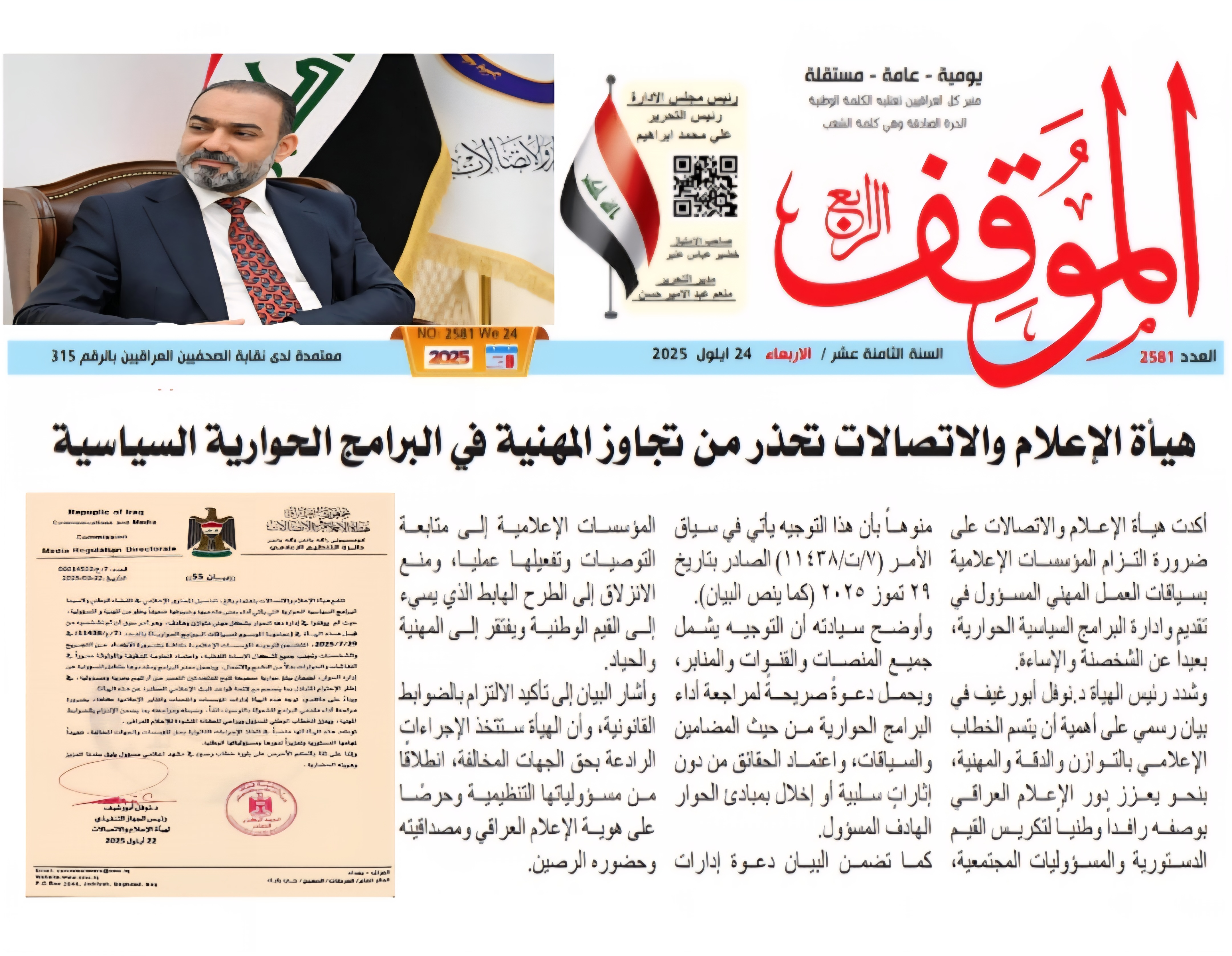 صحيفة الموقف.. هيأة الاعلام والاتصالات تحذر من تجاوز المهنية في البرامج الحوارية السياسية