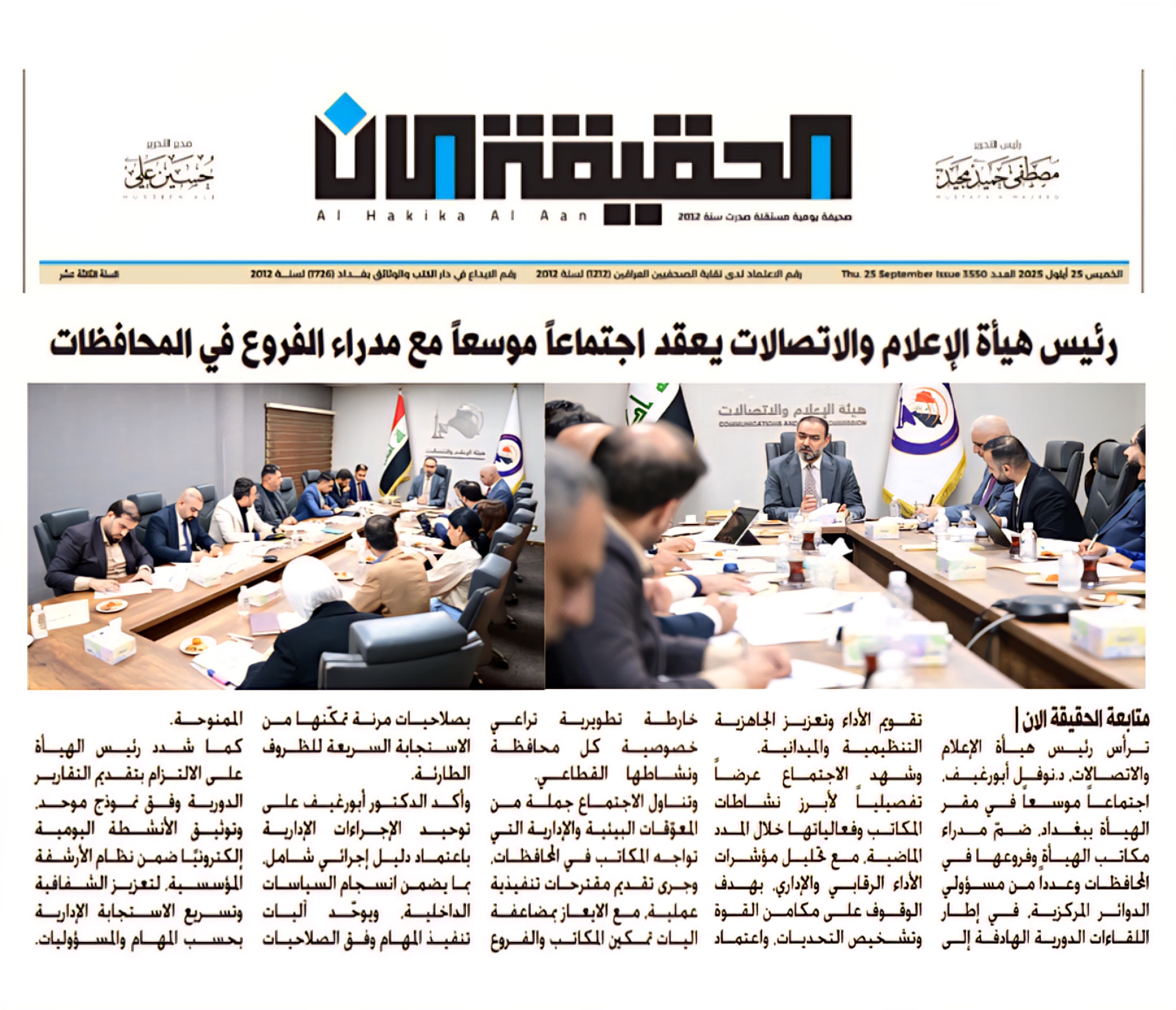 صحيفة الحقيقة الان .. رئيس هيأة الاعلام والاتصالات يعقد اجتماع مع مدراء الفروع في المحافظات